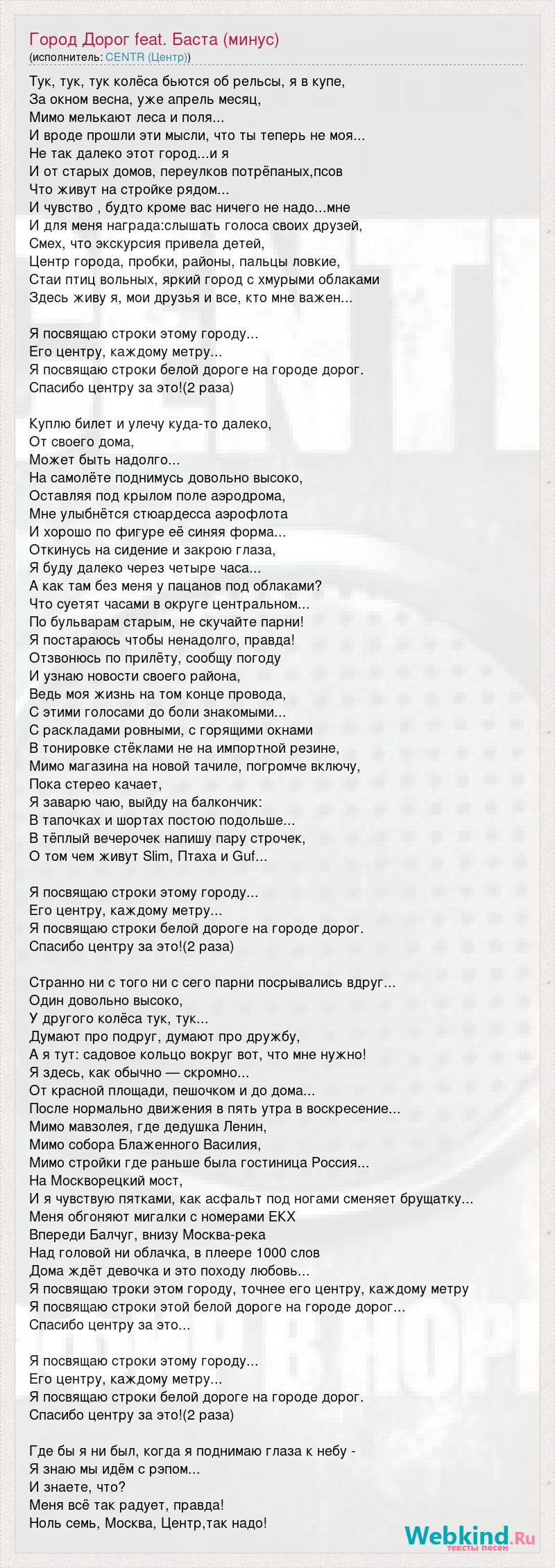 Тук, тук, тук колёса бьются об рельсы, я в купе, За окном весна, уже апрель месяц, Мимо мелькают леса и поля... И вроде прошли эти мысли, что ты теперь не моя... Не так далеко этот город...и я И от старых домов, переулков потрёпаных,псов Что живут на стройке рядом... И чувство , будто кроме вас ничего не надо...мне И для меня награда:слышать голоса своих друзей, Смех, что экскурсия привела детей, Центр города, пробки, районы, пальцы ловкие, Стаи птиц вольных, яркий город с хмурыми облаками Здесь живу я, мои друзья и все, кто мне важен... Я посвящаю строки этому городу... Его центру, каждому метру... Я посвящаю строки белой дороге на городе дорог. Спасибо центру за это!(2 раза) Куплю билет и улечу куда-то далеко, От своего дома, Может быть надолго... На самолёте поднимусь довольно высоко, Оставляя под крылом поле аэродрома, Мне улыбнётся стюардесса аэрофлота И хорошо по фигуре её синяя форма... Откинусь на сидение и закрою глаза, Я буду далеко через четыре часа... А как там без меня у пацанов под облаками? Что суетят часами в округе центральном... По бульварам старым, не скучайте парни! Я постараюсь чтобы ненадолго, правда! Отзвонюсь по прилёту, сообщу погоду И узнаю новости своего района, Ведь моя жизнь на том конце провода, С этими голосами до боли знакомыми... С раскладами ровными, с горящими окнами В тонировке стёклами не на импортной резине, Мимо магазина на новой тачиле, погромче включу, Пока стерео качает, Я заварю чаю, выйду на балкончик: В тапочках и шортах постою подольше... В тёплый вечерочек напишу пару строчек, О том чем живут Slim, Птаха и Guf... Я посвящаю строки этому городу... Его центру, каждому метру... Я посвящаю строки белой дороге на городе дорог. Спасибо центру за это!(2 раза) Странно ни с того ни с сего парни посрывались вдруг... Один довольно высоко, У другого колёса тук, тук... Думают про подруг, думают про дружбу, А я тут: садовое кольцо вокруг вот, что мне нужно! Я здесь, как обычно — скромно... От красной площади, пешочком и до дома... После нормально движения в пять утра в воскресение... Мимо мавзолея, где дедушка Ленин, Мимо собора Блаженного Василия, Мимо стройки где раньше была гостиница Россия... На Москворецкий мост, И я чувствую пятками, как асфальт под ногами сменяет брущатку... Меня обгоняют мигалки с номерами ЕКХ Впереди Балчуг, внизу Москва-река Над головой ни облачка, в плеере 1000 слов Дома ждёт девочка и это походу любовь... Я посвящаю троки этом городу, точнее его центру, каждому метру Я посвящаю строки этой белой дороге на городе дорог... Спасибо центру за это... Я посвящаю строки этому городу... Его центру, каждому метру... Я посвящаю строки белой дороге на городе дорог. Спасибо центру за это!(2 раза) Где бы я ни был, когда я поднимаю глаза к небу - Я знаю мы идём с рэпом... И знаете, что? Меня всё так радует, правда! Ноль семь, Москва, Центр,так надо!