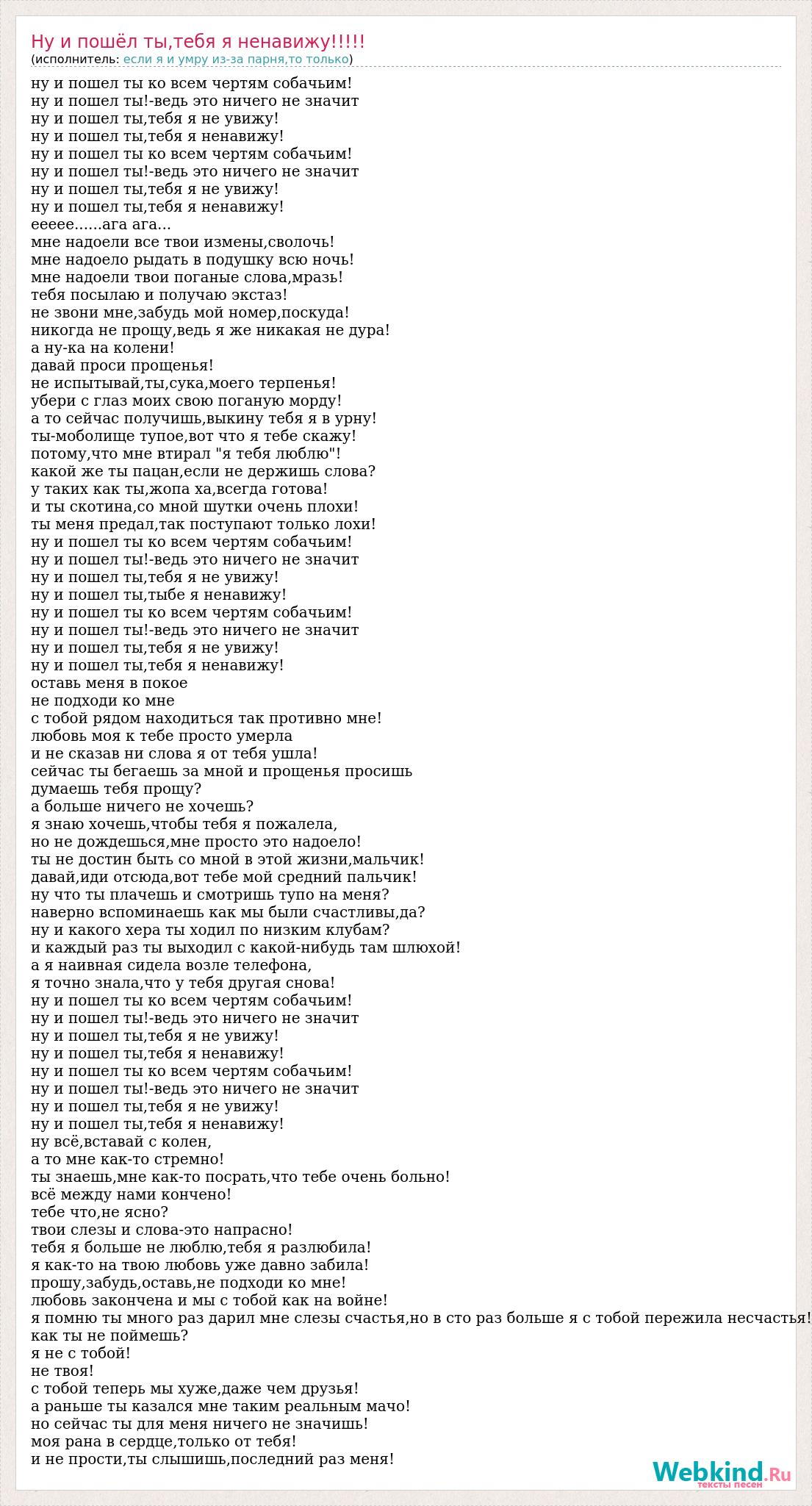 ну и пошел ты ко всем чертям собачьим! ну и пошел ты!-ведь это ничего не значит ну и пошел ты,тебя я не увижу! ну и пошел ты,тебя я ненавижу! ну и пошел ты ко всем чертям собачьим! ну и пошел ты!-ведь это ничего не значит ну и пошел ты,тебя я не увижу! ну и пошел ты,тебя я ненавижу! еееее......ага ага... мне надоели все твои измены,сволочь! мне надоело рыдать в подушку всю ночь! мне надоели твои поганые слова,мразь! тебя посылаю и получаю экстаз! не звони мне,забудь мой номер,поскуда! никогда не прощу,ведь я же никакая не дура! а ну-ка на колени! давай проси прощенья! не испытывай,ты,сука,моего терпенья! убери с глаз моих свою поганую морду! а то сейчас получишь,выкину тебя я в урну! ты-моболище тупое,вот что я тебе скажу! потому,что мне втирал "я тебя люблю"! какой же ты пацан,если не держишь слова? у таких как ты,жопа ха,всегда готова! и ты скотина,со мной шутки очень плохи! ты меня предал,так поступают только лохи! ну и пошел ты ко всем чертям собачьим! ну и пошел ты!-ведь это ничего не значит ну и пошел ты,тебя я не увижу! ну и пошел ты,тыбе я ненавижу! ну и пошел ты ко всем чертям собачьим! ну и пошел ты!-ведь это ничего не значит ну и пошел ты,тебя я не увижу! ну и пошел ты,тебя я ненавижу! оставь меня в покое не подходи ко мне с тобой рядом находиться так противно мне! любовь моя к тебе просто умерла и не сказав ни слова я от тебя ушла! сейчас ты бегаешь за мной и прощенья просишь думаешь тебя прощу? а больше ничего не хочешь? я знаю хочешь,чтобы тебя я пожалела, но не дождешься,мне просто это надоело! ты не достин быть со мной в этой жизни,мальчик! давай,иди отсюда,вот тебе мой средний пальчик! ну что ты плачешь и смотришь тупо на меня? наверно вспоминаешь как мы были счастливы,да? ну и какого хера ты ходил по низким клубам? и каждый раз ты выходил с какой-нибудь там шлюхой! а я наивная сидела возле телефона, я точно знала,что у тебя другая снова! ну и пошел ты ко всем чертям собачьим! ну и пошел ты!-ведь это ничего не значит ну и пошел ты,тебя я не увижу! ну и пошел ты,тебя я ненавижу! ну и пошел ты ко всем чертям собачьим! ну и пошел ты!-ведь это ничего не значит ну и пошел ты,тебя я не увижу! ну и пошел ты,тебя я ненавижу! ну всё,вставай с колен, а то мне как-то стремно! ты знаешь,мне как-то посрать,что тебе очень больно! всё между нами кончено! тебе что,не ясно? твои слезы и слова-это напрасно! тебя я больше не люблю,тебя я разлюбила! я как-то на твою любовь уже давно забила! прошу,забудь,оставь,не подходи ко мне! любовь закончена и мы с тобой как на войне! я помню ты много раз дарил мне слезы счастья,но в сто раз больше я с тобой пережила несчастья! как ты не поймешь? я не с тобой! не твоя! с тобой теперь мы хуже,даже чем друзья! а раньше ты казался мне таким реальным мачо! но сейчас ты для меня ничего не значишь! моя рана в сердце,только от тебя! и не прости,ты слышишь,последний раз меня!
