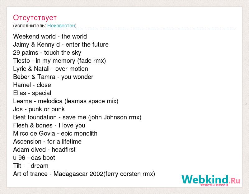 Weekend world - the world Jaimy & Kenny d - enter the future 29 palms - touch the sky Tiesto - in my memory (fade rmx) Lyric & Natali - over motion Beber & Tamra - you wonder Hamel - close Elias - spacial Leama - melodica (leamas space mix) Jds - punk or punk Beat foundation - save me (john Johnson rmx) Flesh & bones - I love you Mirco de Govia - epic monolith Ascension - for a lifetime Adam dived - headfirst u 96 - das boot Tilt - I dream Art of trance - Madagascar 2002(ferry corsten rmx)