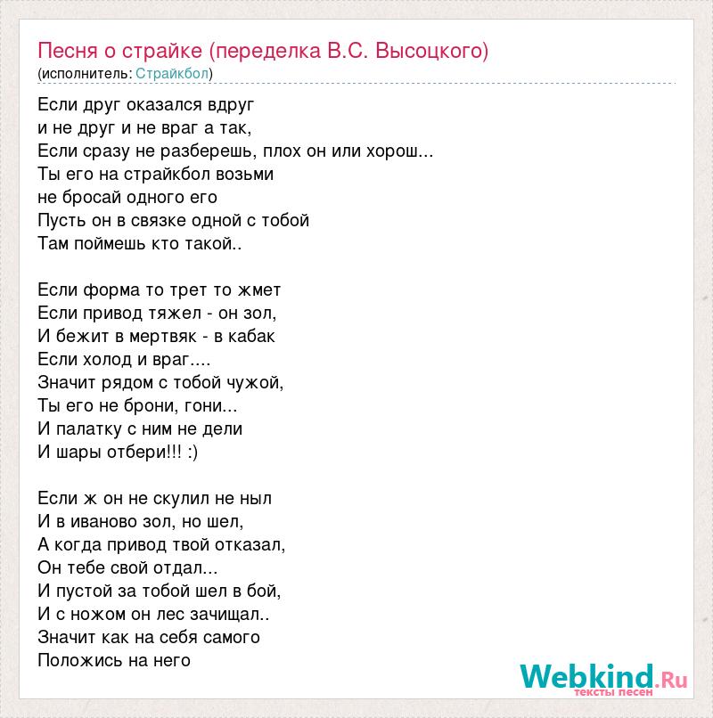 Если друг оказался вдруг и не друг и не враг а так, Если сразу не разберешь, плох он или хорош... Ты его на страйкбол возьми не бросай одного его Пусть он в связке одной с тобой Там поймешь кто такой.. Если форма то трет то жмет Если привод тяжел - он зол, И бежит в мертвяк - в кабак Если холод и враг.... Значит рядом с тобой чужой, Ты его не брони, гони... И палатку с ним не дели И шары отбери!!! :) Если ж он не скулил не ныл И в иваново зол, но шел, А когда привод твой отказал, Он тебе свой отдал... И пустой за тобой шел в бой, И с ножом он лес зачищал.. Значит как на себя самого Положись на него