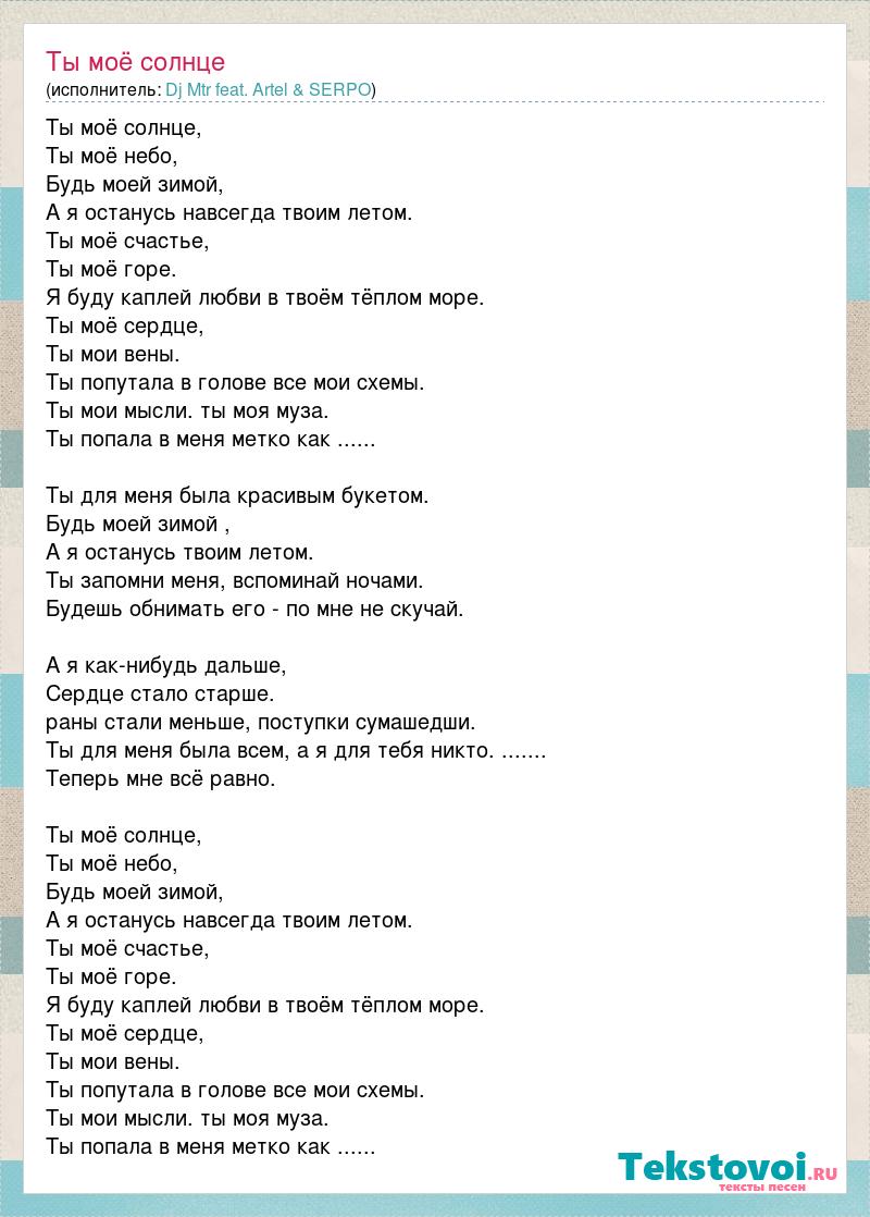 Ты моё солнце, Ты моё небо, Будь моей зимой, А я останусь навсегда твоим летом. Ты моё счастье, Ты моё горе. Я буду каплей любви в твоём тёплом море. Ты моё сердце, Ты мои вены. Ты попутала в голове все мои схемы. Ты мои мысли. ты моя муза. Ты попала в меня метко как ...... Ты для меня была красивым букетом. Будь моей зимой , А я останусь твоим летом. Ты запомни меня, вспоминай ночами. Будешь обнимать его - по мне не скучай. А я как-нибудь дальше, Сердце стало старше. раны стали меньше, поступки сумашедши. Ты для меня была всем, а я для тебя никто. ....... Теперь мне всё равно. Ты моё солнце, Ты моё небо, Будь моей зимой, А я останусь навсегда твоим летом. Ты моё счастье, Ты моё горе. Я буду каплей любви в твоём тёплом море. Ты моё сердце, Ты мои вены. Ты попутала в голове все мои схемы. Ты мои мысли. ты моя муза. Ты попала в меня метко как ......
