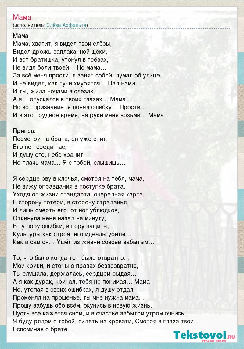 Мама Мама, хватит, я видел твои слёзы, Видел дрожь заплаканной щеки, И вот братишка, утонул в грёзах, Не видя боли твоей… Но мама… За всё меня прости, я занят собой, думал об улице, И не видел, как тучи хмурятся… Над нами… И ты, жила ночами в слезах. А я… опускался в твоих глазах… Мама… Но вот признание, я понял ошибку… Прости… И в это трудное время, на руки меня возьми… Мама… Припев: Посмотри на брата, он уже спит, Его нет среди нас, И душу его, небо хранит. Не плачь мама… Я с тобой, слышишь… Я сердце рву в клочья, смотря на тебя, мама, Не вижу оправдания в поступке брата, Уходя от жизни стандарта, очередная карта, В сторону потери, в сторону страданья, И лишь смерть его, от ног ублюдков, Откинула меня назад на минуту, В ту пору ошибки, в пору защиты, Культуры как строя, его идеалы убиты… Как и сам он… Ушёл из жизни совсем забытым… То, что было когда-то - было отвратно… Мои крики, и стоны о правах безвозвратно, Ты слушала, держалась, сердцем рыдая… А я как дурак, кричал, тебя не понимая… Мама Но, утопая в своих ошибках, я душу отдал Променял на прощенье, ты мне нужна мама… Прошу забудь обо всём, окунись в новую жизнь, Пусть всё кажется сном, и в счастье забытом утром очнись… Я буду рядом с тобой, сидеть на кровати, Смотря в глаза твои… Вспоминая о брате…