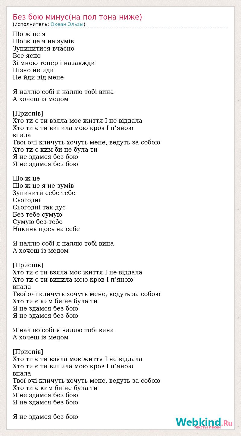 Що ж це я Що ж це я не зумів Зупинитися вчасно Все ясно Зі мною тепер і назавжди Пізно не йди Не йди від мене Я наллю собі я наллю тобі вина А хочеш із медом [Приспів] Хто ти є ти взяла моє життя І не віддала Хто ти є ти випила мою кров І п’яною впала Твої очі кличуть хочуть мене, ведуть за собою Хто ти є ким би не була ти Я не здамся без бою Я не здамся без бою Шо ж це Шо ж це я не зумів Зупинити себе тебе Сьогодні Сьогодні так дує Без тебе сумую Сумую без тебе Накинь щось на себе Я наллю собі я наллю тобі вина А хочеш із медом [Приспів] Хто ти є ти взяла моє життя І не віддала Хто ти є ти випила мою кров І п’яною впала Твої очі кличуть хочуть мене, ведуть за собою Хто ти є ким би не була ти Я не здамся без бою Я не здамся без бою Я наллю собі я наллю тобі вина А хочеш із медом [Приспів] Хто ти є ти взяла моє життя І не віддала Хто ти є ти випила мою кров І п’яною впала Твої очі кличуть хочуть мене, ведуть за собою Хто ти є ким би не була ти Я не здамся без бою Я не здамся без бою Я не здамся без бою