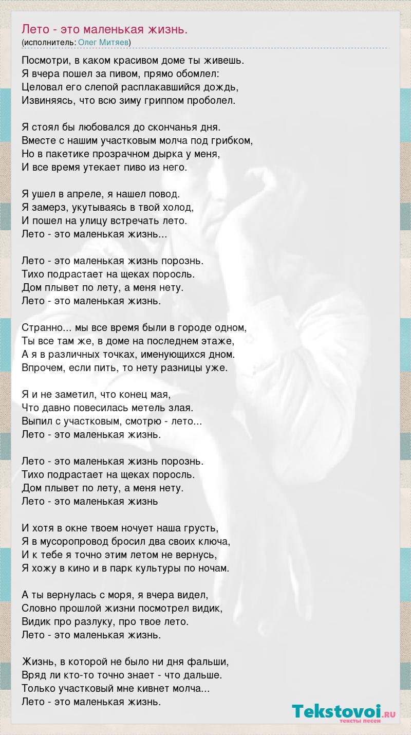 Посмотри, в каком красивом доме ты живешь. Я вчера пошел за пивом, прямо обомлел: Целовал его слепой расплакавшийся дождь, Извиняясь, что всю зиму гриппом проболел. Я стоял бы любовался до скончанья дня. Вместе с нашим участковым молча под грибком, Но в пакетике прозрачном дырка у меня, И все время утекает пиво из него. Я ушел в апреле, я нашел повод. Я замерз, укутываясь в твой холод, И пошел на улицу встречать лето. Лето - это маленькая жизнь... Лето - это маленькая жизнь порознь. Тихо подрастает на щеках поросль. Дом плывет по лету, а меня нету. Лето - это маленькая жизнь. Странно... мы все время были в городе одном, Ты все там же, в доме на последнем этаже, А я в различных точках, именующихся дном. Впрочем, если пить, то нету разницы уже. Я и не заметил, что конец мая, Что давно повесилась метель злая. Выпил с участковым, смотрю - лето... Лето - это маленькая жизнь. Лето - это маленькая жизнь порознь. Тихо подрастает на щеках поросль. Дом плывет по лету, а меня нету. Лето - это маленькая жизнь И хотя в окне твоем ночует наша грусть, Я в мусоропровод бросил два своих ключа, И к тебе я точно этим летом не вернусь, Я хожу в кино и в парк культуры по ночам. А ты вернулась с моря, я вчера видел, Словно прошлой жизни посмотрел видик, Видик про разлуку, про твое лето. Лето - это маленькая жизнь. Жизнь, в которой не было ни дня фальши, Вряд ли кто-то точно знает - что дальше. Только участковый мне кивнет молча... Лето - это маленькая жизнь.