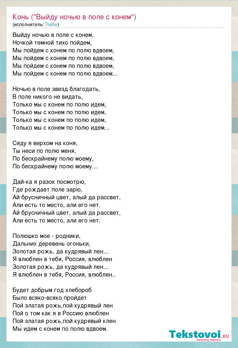 Выйду ночью в поле с конем, Ночкой темной тихо пойдем, Мы пойдем с конем по полю вдвоем, Мы пойдем с конем по полю вдвоем, Мы пойдем с конем по полю вдвоем, Мы пойдем с конем по полю вдвоем... Ночью в поле звезд благодать, В поле никого не видать, Только мы с конем по полю идем, Только мы с конем по полю идем, Только мы с конем по полю идем, Только мы с конем по полю идем... Сяду я верхом на коня, Ты неси по полю меня, По бескрайнему полю моему, По бескрайнему полю моему… Дай-ка я разок посмотрю, Где рождает поле зарю, Ай брусничный цвет, алый да рассвет, Али есть то место, али его нет. Ай брусничный цвет, алый да рассвет, Али есть то место, али его нет. Полюшко мое - родники, Дальних деревень огоньки, Золотая рожь, да кудрявый лен... Я влюблен в тебя, Россия, влюблен Золотая рожь, да кудрявый лен... Я влюблен в тебя, Россия, влюблен.. Будет добрым год хлебороб Было всяко-всяко пройдет Пой златая рожь,пой кудрявый лен Пой о том как я в Россию влюблен Пой златая рожь,пой кудрявый клен Мы идем с конем по полю вдвоем.