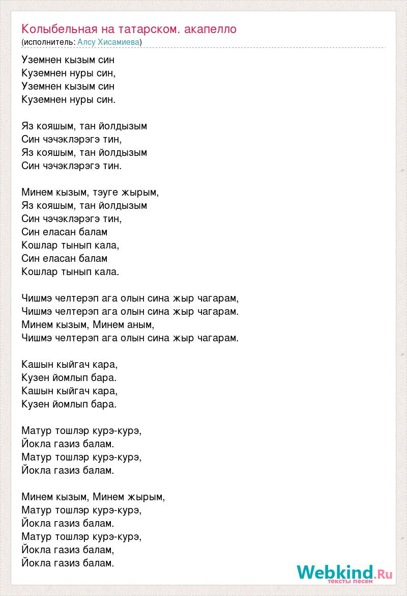 Уземнен кызым син Куземнен нуры син, Уземнен кызым син Куземнен нуры син. Яз кояшым, тан йолдызым Син чэчэклэрэгэ тин, Яз кояшым, тан йолдызым Син чэчэклэрэгэ тин. Минем кызым, тэуге жырым, Яз кояшым, тан йолдызым Син чэчэклэрэгэ тин, Син еласан балам Кошлар тынып кала, Син еласан балам Кошлар тынып кала. Чишмэ челтерэп ага олын сина жыр чагарам, Чишмэ челтерэп ага олын сина жыр чагарам. Минем кызым, Минем аным, Чишмэ челтерэп ага олын сина жыр чагарам. Кашын кыйгач кара, Кузен йомлып бара. Кашын кыйгач кара, Кузен йомлып бара. Матур тошлэр курэ-курэ, Йокла газиз балам. Матур тошлэр курэ-курэ, Йокла газиз балам. Минем кызым, Минем жырым, Матур тошлэр курэ-курэ, Йокла газиз балам. Матур тошлэр курэ-курэ, Йокла газиз балам, Йокла газиз балам.