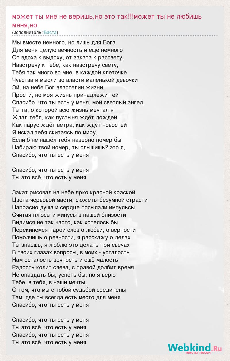 Мы вместе немного, но лишь для Бога Для меня целую вечность и ещё немного От вдоха к выдоху, от заката к рассвету, Навстречу к тебе, как навстречу свету, Тебя так много во мне, в каждой клеточке Чувства и мысли во власти маленькой девочки Эй, на небе Бог властелин жизни, Прости, но моя жизнь принадлежит ей Спасибо, что ты есть у меня, мой светлый ангел, Ты та, о которой всю жизнь мечтал я Ждал тебя, как пустыня ждёт дождей, Как парус ждёт ветра, как ждут новостей Я искал тебя скитаясь по миру, Если б не нашёл тебя наверно помер бы Набираю твой номер, ты слышишь? это я, Спасибо, что ты есть у меня Спасибо, что ты есть у меня Ты это всё, что есть у меня Закат рисовал на небе ярко красной краской Цвета червовой масти, сюжеты безумной страсти Напрасно душа и сердце посылали импульсы Считая плюсы и минусы в нашей близости Видимся не так часто, как хотелось бы Перекинемся парой слов о любви, о верности Помолчишь о ревности, я расскажу о делах Ты знаешь, я люблю это делать при свечах В твоих глазах вопросы, в моих - усталость Нам осталость вечность и ещё малость Радость колит слева, с правой долбит время Не опаздать бы, успеть бы, но я верю Тебе, в тебя, в наши мечты, О том, что мы с тобой судьбой соединены Там, где ты всегда есть место для меня Спасибо, что ты есть у меня Спасибо, что ты есть у меня Ты это всё, что есть у меня Спасибо, что ты есть у меня Ты это всё, что есть у меня