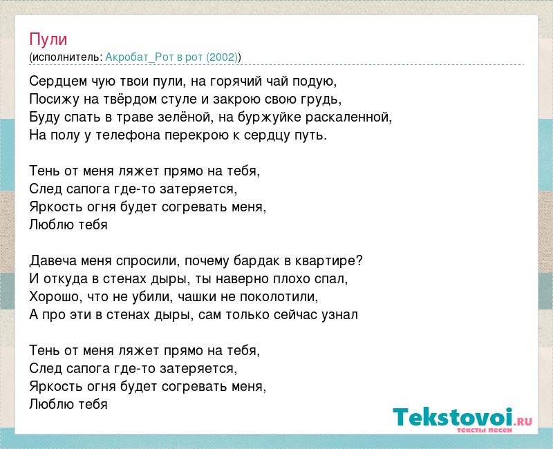 Сердцем чую твои пули, на горячий чай подую, Посижу на твёрдом стуле и закрою свою грудь, Буду спать в траве зелёной, на буржуйке раскаленной, На полу у телефона перекрою к сердцу путь. Тень от меня ляжет прямо на тебя, След сапога где-то затеряется, Яркость огня будет согревать меня, Люблю тебя Давеча меня спросили, почему бардак в квартире? И откуда в стенах дыры, ты наверно плохо спал, Хорошо, что не убили, чашки не поколотили, А про эти в стенах дыры, сам только сейчас узнал Тень от меня ляжет прямо на тебя, След сапога где-то затеряется, Яркость огня будет согревать меня, Люблю тебя