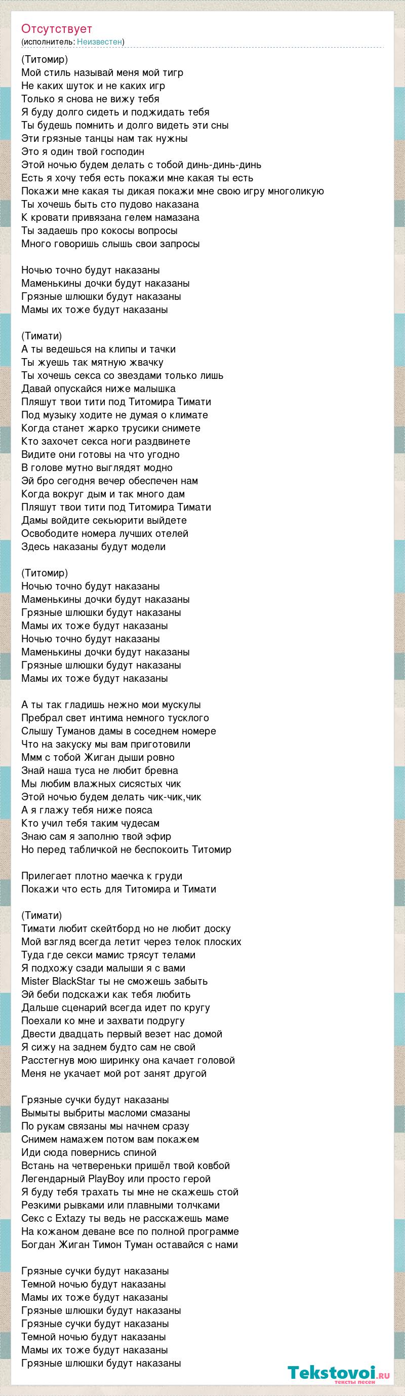 (Титомир) Мой стиль называй меня мой тигр Не каких шуток и не каких игр Только я снова не вижу тебя Я буду долго сидеть и поджидать тебя Ты будешь помнить и долго видеть эти сны Эти грязные танцы нам так нужны Это я один твой господин Этой ночью будем делать с тобой динь-динь-динь Есть я хочу тебя есть покажи мне какая ты есть Покажи мне какая ты дикая покажи мне свою игру многоликую Ты хочешь быть сто пудово наказана К кровати привязана гелем намазана Ты задаешь про кокосы вопросы Много говоришь слышь свои запросы Ночью точно будут наказаны Маменькины дочки будут наказаны Грязные шлюшки будут наказаны Мамы их тоже будут наказаны (Тимати) А ты ведешься на клипы и тачки Ты жуешь так мятную жвачку Ты хочешь секса со звездами только лишь Давай опускайся ниже малышка Пляшут твои тити под Титомира Тимати Под музыку ходите не думая о климате Когда станет жарко трусики снимете Кто захочет секса ноги раздвинете Видите они готовы на что угодно В голове мутно выглядят модно Эй бро сегодня вечер обеспечен нам Когда вокруг дым и так много дам Пляшут твои тити под Титомира Тимати Дамы войдите секьюрити выйдете Освободите номера лучших отелей Здесь наказаны будут модели (Титомир) Ночью точно будут наказаны Маменькины дочки будут наказаны Грязные шлюшки будут наказаны Мамы их тоже будут наказаны Ночью точно будут наказаны Маменькины дочки будут наказаны Грязные шлюшки будут наказаны Мамы их тоже будут наказаны А ты так гладишь нежно мои мускулы Пребрал свет интима немного тусклого Слышу Туманов дамы в соседнем номере Что на закуску мы вам приготовили Ммм с тобой Жиган дыши ровно Знай наша туса не любит бревна Мы любим влажных сисястых чик Этой ночью будем делать чик-чик,чик А я глажу тебя ниже пояса Кто учил тебя таким чудесам Знаю сам я заполню твой эфир Но перед табличкой не беспокоить Титомир Прилегает плотно маечка к груди Покажи что есть для Титомира и Тимати (Тимати) Тимати любит скейтборд но не любит доску Мой взгляд всегда летит через телок плоских Туда где секси мамис трясут телами Я подхожу сзади малыши я с вами Mister BlackStar ты не сможешь забыть Эй беби подскажи как тебя любить Дальше сценарий всегда идет по кругу Поехали ко мне и захвати подругу Двести двадцать первый везет нас домой Я сижу на заднем будто сам не свой Расстегнув мою ширинку она качает головой Меня не укачает мой рот занят другой Грязные сучки будут наказаны Вымыты выбриты масломи смазаны По рукам связаны мы начнем сразу Снимем намажем потом вам покажем Иди сюда повернись спиной Встань на четвереньки пришёл твой ковбой Легендарный PlayBoy или просто герой Я буду тебя трахать ты мне не скажешь стой Резкими рывками или плавными толчками Секс с Extazy ты ведь не расскажешь маме На кожаном деване все по полной программе Богдан Жиган Тимон Туман оставайся с нами Грязные сучки будут наказаны Темной ночью будут наказаны Мамы их тоже будут наказаны Грязные шлюшки будут наказаны Грязные сучки будут наказаны Темной ночью будут наказаны Мамы их тоже будут наказаны Грязные шлюшки будут наказаны