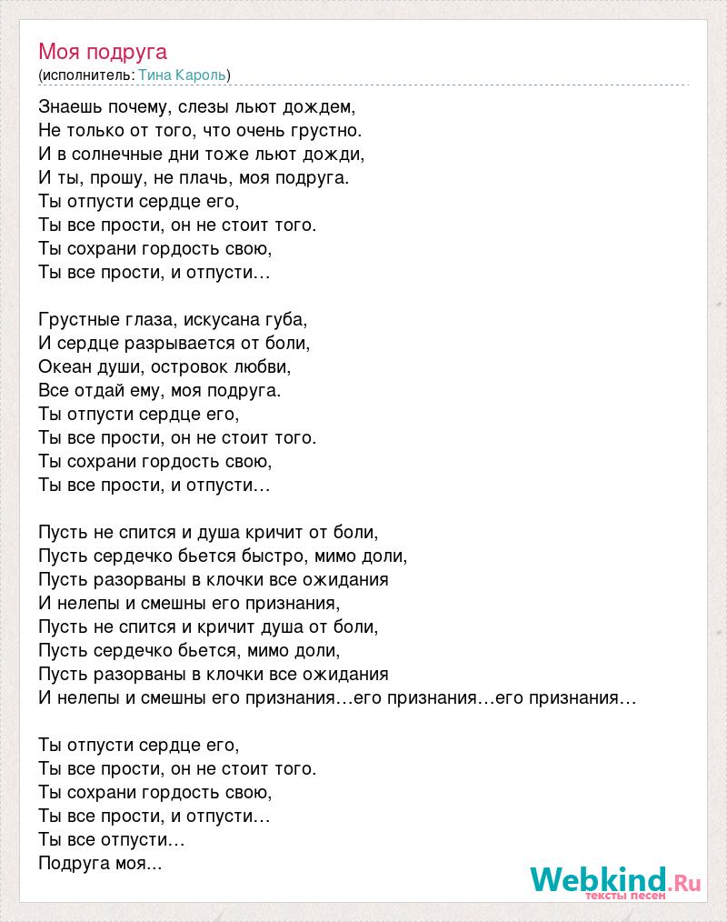 Знаешь почему, слезы льют дождем, Не только от того, что очень грустно. И в солнечные дни тоже льют дожди, И ты, прошу, не плачь, моя подруга. Ты отпусти сердце его, Ты все прости, он не стоит того. Ты сохрани гордость свою, Ты все прости, и отпусти… Грустные глаза, искусана губа, И сердце разрывается от боли, Океан души, островок любви, Все отдай ему, моя подруга. Ты отпусти сердце его, Ты все прости, он не стоит того. Ты сохрани гордость свою, Ты все прости, и отпусти… Пусть не спится и душа кричит от боли, Пусть сердечко бьется быстро, мимо доли, Пусть разорваны в клочки все ожидания И нелепы и смешны его признания, Пусть не спится и кричит душа от боли, Пусть сердечко бьется, мимо доли, Пусть разорваны в клочки все ожидания И нелепы и смешны его признания…его признания…его признания… Ты отпусти сердце его, Ты все прости, он не стоит того. Ты сохрани гордость свою, Ты все прости, и отпусти… Ты все отпусти… Подруга моя...