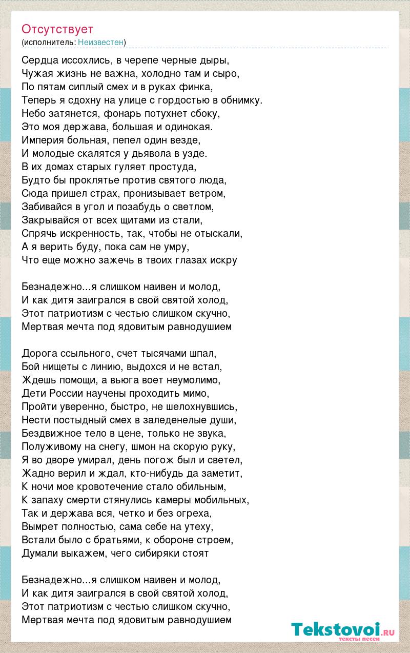 Сердца иссохлись, в черепе черные дыры, Чужая жизнь не важна, холодно там и сыро, По пятам сиплый смех и в руках финка, Теперь я сдохну на улице с гордостью в обнимку. Небо затянется, фонарь потухнет сбоку, Это моя держава, большая и одинокая. Империя больная, пепел один везде, И молодые скалятся у дьявола в узде. В их домах старых гуляет простуда, Будто бы проклятье против святого люда, Сюда пришел страх, пронизывает ветром, Забивайся в угол и позабудь о светлом, Закрывайся от всех щитами из стали, Спрячь искренность, так, чтобы не отыскали, А я верить буду, пока сам не умру, Что еще можно зажечь в твоих глазах искру Безнадежно...я слишком наивен и молод, И как дитя заигрался в свой святой холод, Этот патриотизм с честью слишком скучно, Мертвая мечта под ядовитым равнодушием Дорога ссыльного, счет тысячами шпал, Бой нищеты с линию, выдохся и не встал, Ждешь помощи, а вьюга воет неумолимо, Дети России научены проходить мимо, Пройти уверенно, быстро, не шелохнувшись, Нести постыдный смех в заледенелые души, Бездвижное тело в цене, только не звука, Полуживому на снегу, шмон на скорую руку, Я во дворе умирал, день погож был и светел, Жадно верил и ждал, кто-нибудь да заметит, К ночи мое кровотечение стало обильным, К запаху смерти стянулись камеры мобильных, Так и держава вся, четко и без огреха, Вымрет полностью, сама себе на утеху, Встали было с братьями, к обороне строем, Думали выкажем, чего сибиряки стоят Безнадежно...я слишком наивен и молод, И как дитя заигрался в свой святой холод, Этот патриотизм с честью слишком скучно, Мертвая мечта под ядовитым равнодушием