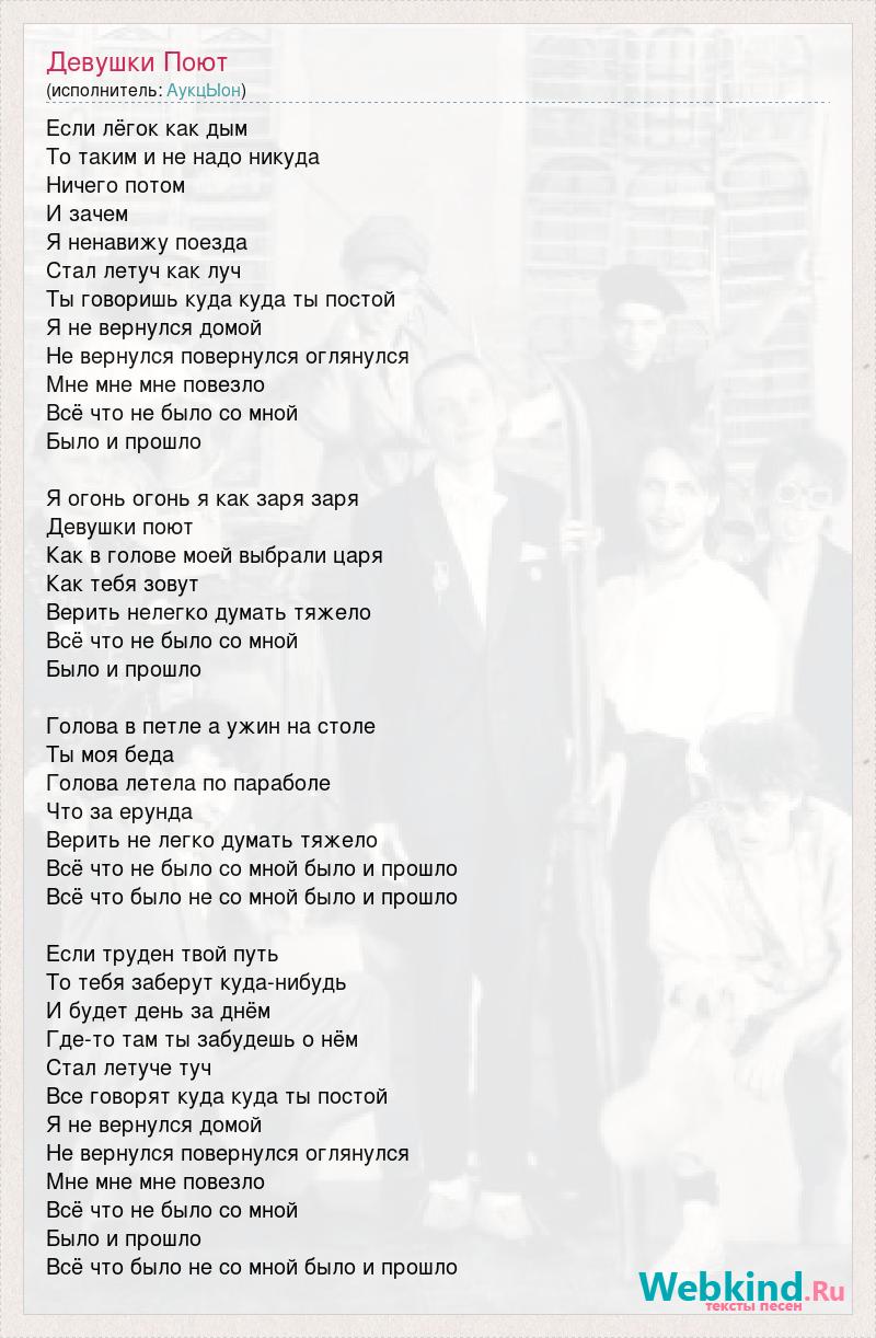 Если лёгок как дым То таким и не надо никуда Ничего потом И зачем Я ненавижу поезда Стал летуч как луч Ты говоришь куда куда ты постой Я не вернулся домой Не вернулся повернулся оглянулся Мне мне мне повезло Всё что не было со мной Было и прошло Я огонь огонь я как заря заря Девушки поют Как в голове моей выбрали царя Как тебя зовут Верить нелегко думать тяжело Всё что не было со мной Было и прошло Голова в петле а ужин на столе Ты моя беда Голова летела по параболе Что за ерунда Верить не легко думать тяжело Всё что не было со мной было и прошло Всё что было не со мной было и прошло Если труден твой путь То тебя заберут куда-нибудь И будет день за днём Где-то там ты забудешь о нём Стал летуче туч Все говорят куда куда ты постой Я не вернулся домой Не вернулся повернулся оглянулся Мне мне мне повезло Всё что не было со мной Было и прошло Всё что было не со мной было и прошло