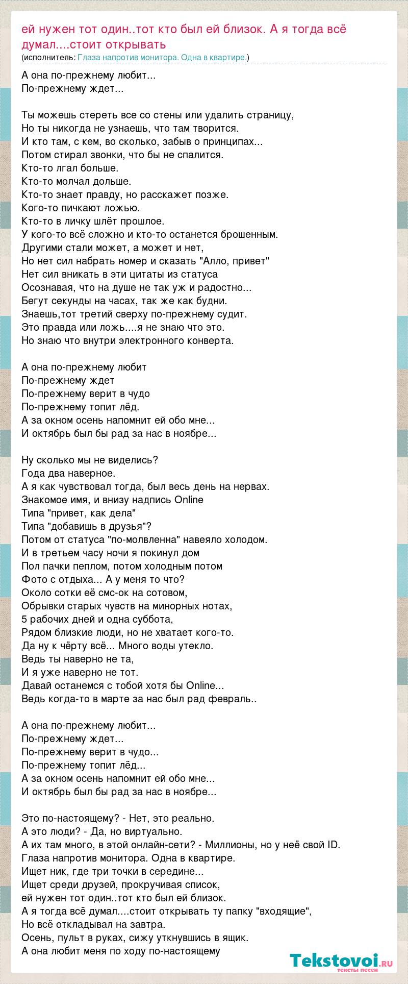 Главная→Исполнители→Глаза напротив монитора. Одна в квартире.→Ей нужен тот один..тот кто был ей близок. А я тогда всё думал....стоит о