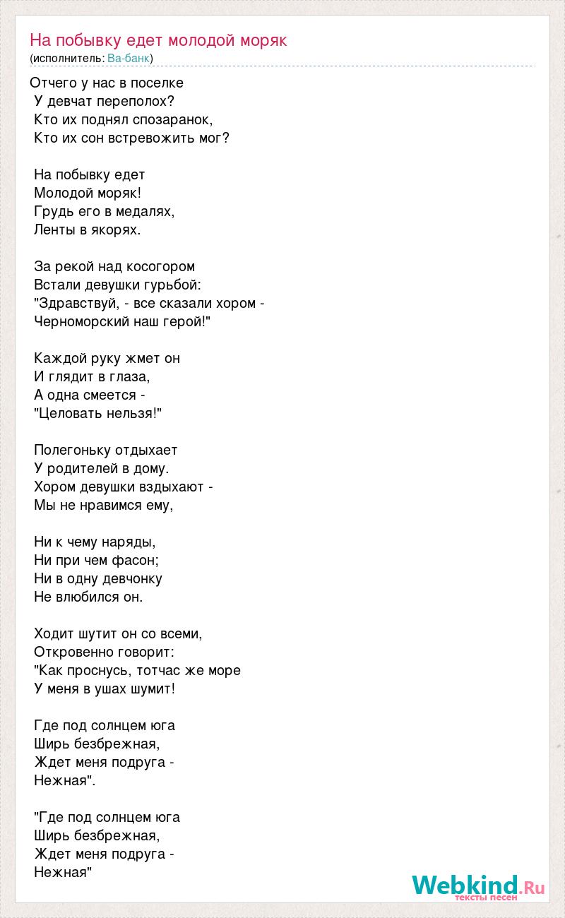 Отчего у нас в поселке У девчат переполох? Кто их поднял спозаранок, Кто их сон встревожить мог? На побывку едет Молодой моряк! Грудь его в медалях, Ленты в якорях. За рекой над косогором Встали девушки гурьбой: "Здравствуй, - все сказали хором - Черноморский наш герой!" Каждой руку жмет он И глядит в глаза, А одна смеется - "Целовать нельзя!" Полегоньку отдыхает У родителей в дому. Хором девушки вздыхают - Мы не нравимся ему, Ни к чему наряды, Ни при чем фасон; Ни в одну девчонку Не влюбился он. Ходит шутит он со всеми, Откровенно говорит: "Как проснусь, тотчас же море У меня в ушах шумит! Где под солнцем юга Ширь безбрежная, Ждет меня подруга - Нежная". "Где под солнцем юга Ширь безбрежная, Ждет меня подруга - Нежная"