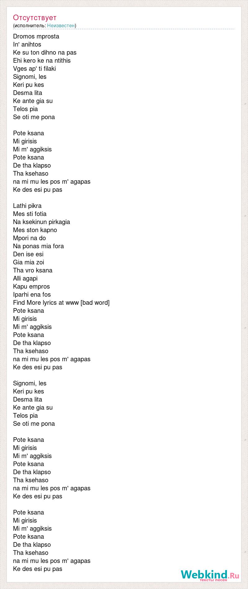 Dromos mprosta In' anihtos Ke su ton dihno na pas Ehi kero ke na ntithis Vges ap' ti filaki Signomi, les Keri pu kes Desma lita Ke ante gia su Telos pia Se oti me pona Pote ksana Mi girisis Mi m' aggiksis Pote ksana De tha klapso Tha ksehaso na mi mu les pos m' agapas Ke des esi pu pas Lathi pikra Mes sti fotia Na ksekinun pirkagia Mes ston kapno Mpori na do Na ponas mia fora Den ise esi Gia mia zoi Tha vro ksana Alli agapi Kapu empros Iparhi ena fos Find More lyrics at www [bad word] Pote ksana Mi girisis Mi m' aggiksis Pote ksana De tha klapso Tha ksehaso na mi mu les pos m' agapas Ke des esi pu pas Signomi, les Keri pu kes Desma lita Ke ante gia su Telos pia Se oti me pona Pote ksana Mi girisis Mi m' aggiksis Pote ksana De tha klapso Tha ksehaso na mi mu les pos m' agapas Ke des esi pu pas Pote ksana Mi girisis Mi m' aggiksis Pote ksana De tha klapso Tha ksehaso na mi mu les pos m' agapas Ke des esi pu pas