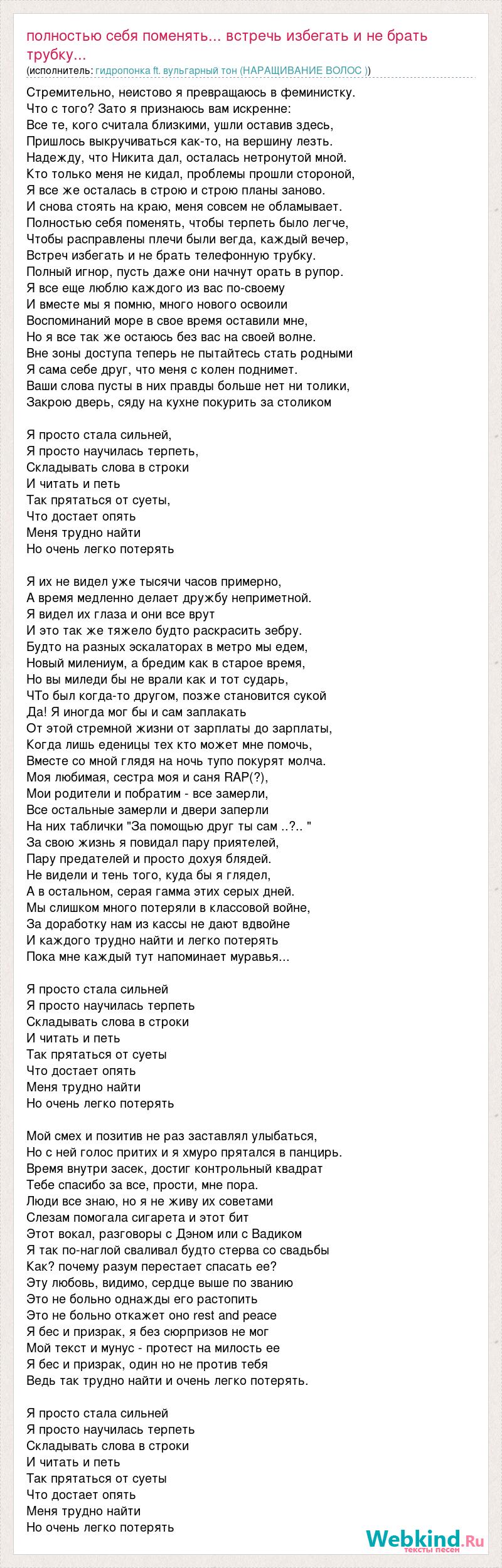 Стремительно, неистово я превращаюсь в феминистку. Что с того? Зато я признаюсь вам искренне: Все те, кого считала близкими, ушли оставив здесь, Пришлось выкручиваться как-то, на вершину лезть. Надежду, что Никита дал, осталась нетронутой мной. Кто только меня не кидал, проблемы прошли стороной, Я все же осталась в строю и строю планы заново. И снова стоять на краю, меня совсем не обламывает. Полностью себя поменять, чтобы терпеть было легче, Чтобы расправлены плечи были вегда, каждый вечер, Встреч избегать и не брать телефонную трубку. Полный игнор, пусть даже они начнут орать в рупор. Я все еще люблю каждого из вас по-своему И вместе мы я помню, много нового освоили Воспоминаний море в свое время оставили мне, Но я все так же остаюсь без вас на своей волне. Вне зоны доступа теперь не пытайтесь стать родными Я сама себе друг, что меня с колен поднимет. Ваши слова пусты в них правды больше нет ни толики, Закрою дверь, сяду на кухне покурить за столиком Я просто стала сильней, Я просто научилась терпеть, Складывать слова в строки И читать и петь Так прятаться от суеты, Что достает опять Меня трудно найти Но очень легко потерять Я их не видел уже тысячи часов примерно, А время медленно делает дружбу неприметной. Я видел их глаза и они все врут И это так же тяжело будто раскрасить зебру. Будто на разных эскалаторах в метро мы едем, Новый милениум, а бредим как в старое время, Но вы миледи бы не врали как и тот сударь, ЧТо был когда-то другом, позже становится сукой Да! Я иногда мог бы и сам заплакать От этой стремной жизни от зарплаты до зарплаты, Когда лишь еденицы тех кто может мне помочь, Вместе со мной глядя на ночь тупо покурят молча. Моя любимая, сестра моя и саня RAP(?), Мои родители и побратим - все замерли, Все остальные замерли и двери заперли На них таблички "За помощью друг ты сам ..?.. " За свою жизнь я повидал пару приятелей, Пару предателей и просто дохуя блядей. Не видели и тень того, куда бы я глядел, А в остальном, серая гамма этих серых дней. Мы слишком много потеряли в классовой войне, За доработку нам из кассы не дают вдвойне И каждого трудно найти и легко потерять Пока мне каждый тут напоминает муравья... Я просто стала сильней Я просто научилась терпеть Складывать слова в строки И читать и петь Так прятаться от суеты Что достает опять Меня трудно найти Но очень легко потерять Мой смех и позитив не раз заставлял улыбаться, Но с ней голос притих и я хмуро прятался в панцирь. Время внутри засек, достиг контрольный квадрат Тебе спасибо за все, прости, мне пора. Люди все знаю, но я не живу их советами Слезам помогала сигарета и этот бит Этот вокал, разговоры с Дэном или с Вадиком Я так по-наглой сваливал будто стерва со свадьбы Как? почему разум перестает спасать ее? Эту любовь, видимо, сердце выше по званию Это не больно однажды его растопить Это не больно откажет оно rest and peace Я бес и призрак, я без сюрпризов не мог Мой текст и мунус - протест на милость ее Я бес и призрак, один но не против тебя Ведь так трудно найти и очень легко потерять. Я просто стала сильней Я просто научилась терпеть Складывать слова в строки И читать и петь Так прятаться от суеты Что достает опять Меня трудно найти Но очень легко потерять