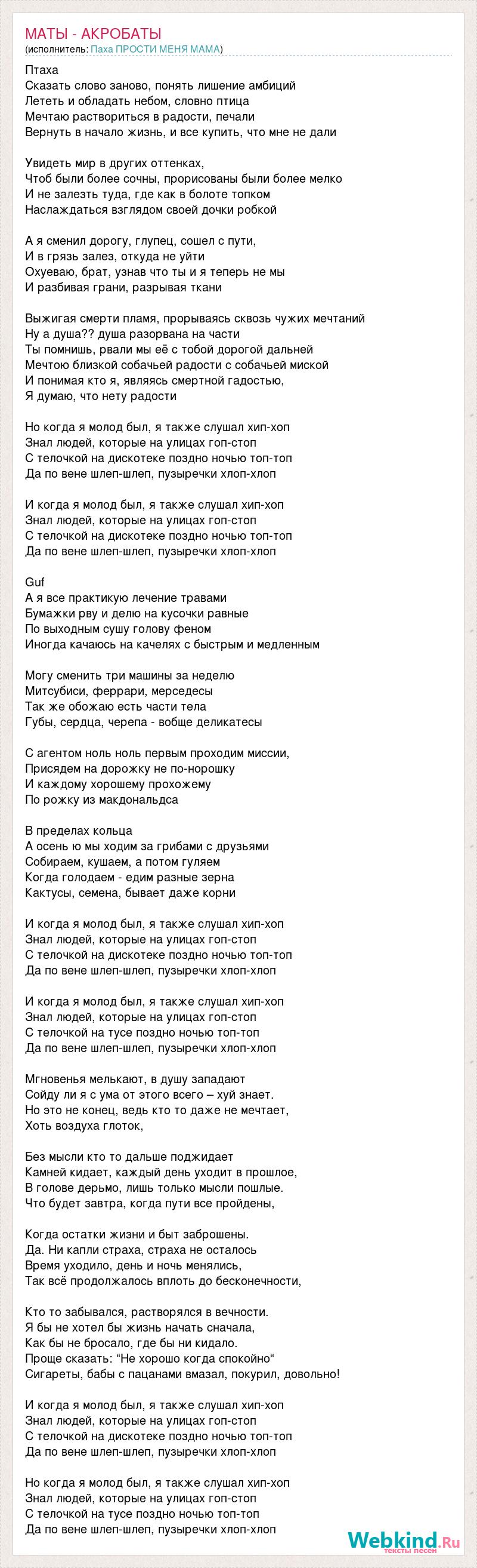 Птаха Сказать слово заново, понять лишение амбиций Лететь и обладать небом, словно птица Мечтаю раствориться в радости, печали Вернуть в начало жизнь, и все купить, что мне не дали Увидеть мир в других оттенках, Чтоб были более сочны, прорисованы были более мелко И не залезть туда, где как в болоте топком Наслаждаться взглядом своей дочки робкой А я сменил дорогу, глупец, сошел с пути, И в грязь залез, откуда не уйти Охуеваю, брат, узнав что ты и я теперь не мы И разбивая грани, разрывая ткани Выжигая смерти пламя, прорываясь сквозь чужих мечтаний Ну а душа?? душа разорвана на части Ты помнишь, рвали мы её с тобой дорогой дальней Мечтою близкой собачьей радости с собачьей миской И понимая кто я, являясь смертной гадостью, Я думаю, что нету радости Но когда я молод был, я также слушал хип-хоп Знал людей, которые на улицах гоп-стоп С телочкой на дискотеке поздно ночью топ-топ Да по вене шлеп-шлеп, пузыречки хлоп-хлоп И когда я молод был, я также слушал хип-хоп Знал людей, которые на улицах гоп-стоп С телочкой на дискотеке поздно ночью топ-топ Да по вене шлеп-шлеп, пузыречки хлоп-хлоп Guf А я все практикую лечение травами Бумажки рву и делю на кусочки равные По выходным сушу голову феном Иногда качаюсь на качелях с быстрым и медленным Могу сменить три машины за неделю Митсубиси, феррари, мерседесы Так же обожаю есть части тела Губы, сердца, черепа - вобще деликатесы С агентом ноль ноль первым проходим миссии, Присядем на дорожку не по-норошку И каждому хорошему прохожему По рожку из макдональдса В пределах кольца А осень ю мы ходим за грибами с друзьями Собираем, кушаем, а потом гуляем Когда голодаем - едим разные зерна Кактусы, семена, бывает даже корни И когда я молод был, я также слушал хип-хоп Знал людей, которые на улицах гоп-стоп С телочкой на дискотеке поздно ночью топ-топ Да по вене шлеп-шлеп, пузыречки хлоп-хлоп И когда я молод был, я также слушал хип-хоп Знал людей, которые на улицах гоп-стоп С телочкой на тусе поздно ночью топ-топ Да по вене шлеп-шлеп, пузыречки хлоп-хлоп Мгновенья мелькают, в душу западают Сойду ли я с ума от этого всего – хуй знает. Но это не конец, ведь кто то даже не мечтает, Хоть воздуха глоток, Без мысли кто то дальше поджидает Камней кидает, каждый день уходит в прошлое, В голове дерьмо, лишь только мысли пошлые. Что будет завтра, когда пути все пройдены, Когда остатки жизни и быт заброшены. Да. Ни капли страха, страха не осталось Время уходило, день и ночь менялись, Так всё продолжалось вплоть до бесконечности, Кто то забывался, растворялся в вечности. Я бы не хотел бы жизнь начать сначала, Как бы не бросало, где бы ни кидало. Проще сказать: “Не хорошо когда спокойно“ Сигареты, бабы с пацанами вмазал, покурил, довольно! И когда я молод был, я также слушал хип-хоп Знал людей, которые на улицах гоп-стоп С телочкой на дискотеке поздно ночью топ-топ Да по вене шлеп-шлеп, пузыречки хлоп-хлоп Но когда я молод был, я также слушал хип-хоп Знал людей, которые на улицах гоп-стоп С телочкой на тусе поздно ночью топ-топ Да по вене шлеп-шлеп, пузыречки хлоп-хлоп