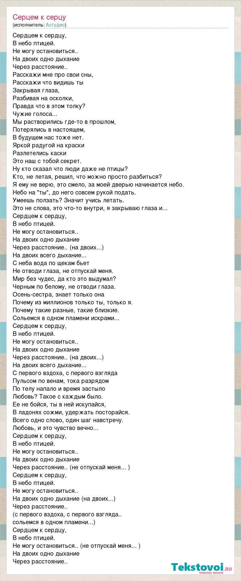 Сердцем к сердцу, В небо птицей. Не могу остановиться.. На двоих одно дыхание Через расстояние.. Расскажи мне про свои сны, Расскажи что видишь ты Закрывая глаза, Разбивая на осколки, Правда что в этом толку? Чужие голоса... Мы растворились где-то в прошлом, Потерялись в настоящем, В будущем нас тоже нет. Яркой радугой на краски Разлетелись каски Это наш с тобой секрет. Ну кто сказал что люди даже не птицы? Кто, не летая, решил, что можно просто разбиться? Я ему не верю, это смело, за моей дверью начинается небо. Небо на "ты", до него совсем рукой подать. Умеешь ползать? Значит учись летать. Это не слова, это что-то внутри, я закрываю глаза и... Сердцем к сердцу, В небо птицей. Не могу остановиться.. На двоих одно дыхание Через расстояние.. (на двоих...) На двоих всего дыхание... С неба вода по щекам бьет Не отводи глаза, не отпускай меня. Мир без чудес, да кто это выдумал? Черным по белому, не отводи глаза. Осень-сестра, знает только она Почему из миллионов только ты, только я. Почему такие разные, такие близкие. Сольемся в одном пламени искрами... Сердцем к сердцу, В небо птицей. Не могу остановиться.. На двоих одно дыхание Через расстояние.. (на двоих...) На двоих всего дыхание... С первого вздоха, с первого взгляда Пульсом по венам, тока разрядом По телу напало и время застыло Любовь? Такое с каждым было. Ее не бойся, ты в ней искупайся, В ладонях сожми, удержать посторайся. Всего одно слово, один шаг навстречу. Любовь, и это чувство вечно... Сердцем к сердцу, В небо птицей. Не могу остановиться.. На двоих одно дыхание Через расстояние.. (не отпускай меня... ) Сердцем к сердцу, В небо птицей. Не могу остановиться.. На двоих одно дыхание (на двоих...) Через расстояние.. (с первого вздоха, с первого взгляда.. сольемся в одном пламени...) Сердцем к сердцу, В небо птицей. Не могу остановиться.. (не отпускай меня... ) На двоих одно дыхание Через расстояние..