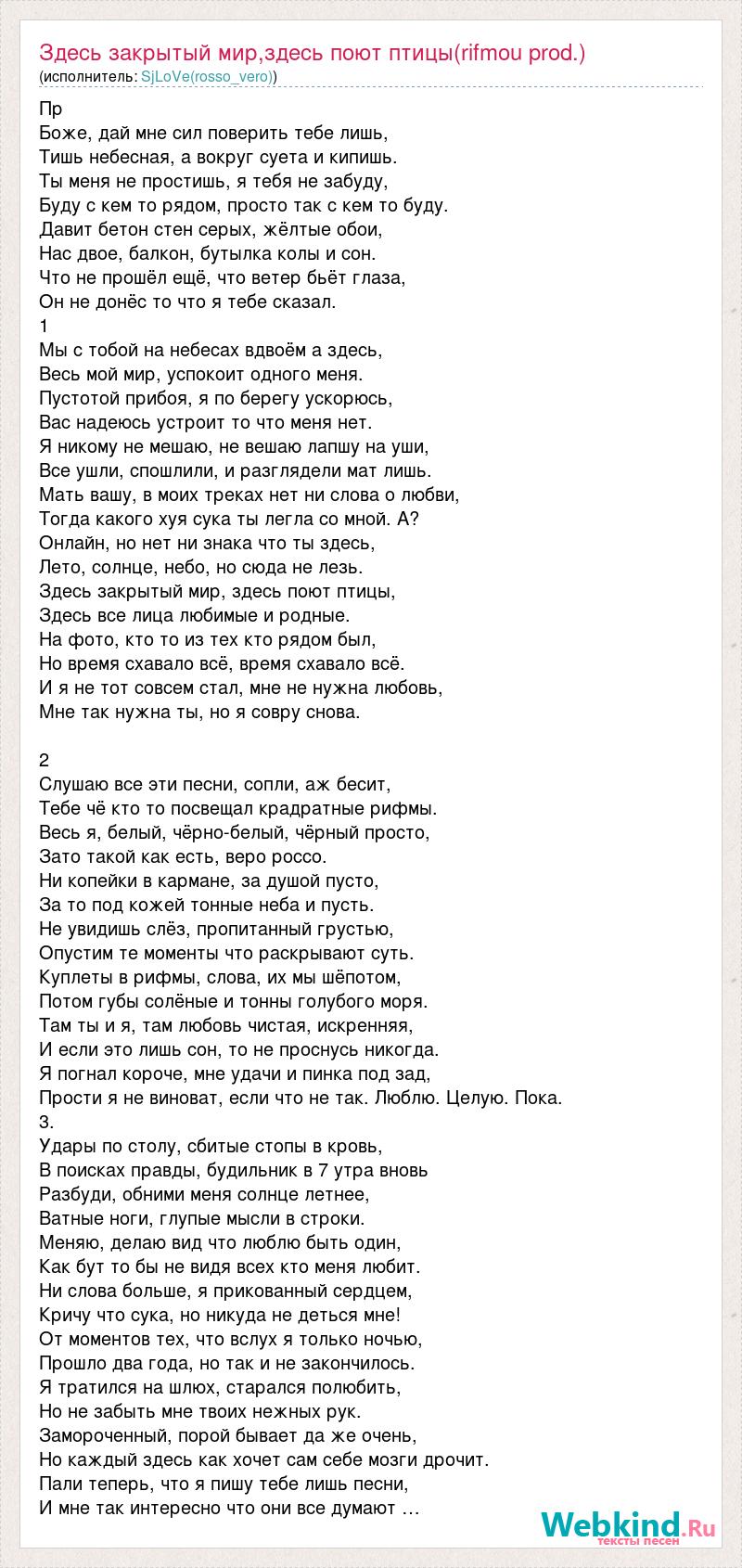 Пр Боже, дай мне сил поверить тебе лишь, Тишь небесная, а вокруг суета и кипишь. Ты меня не простишь, я тебя не забуду, Буду с кем то рядом, просто так с кем то буду. Давит бетон стен серых, жёлтые обои, Нас двое, балкон, бутылка колы и сон. Что не прошёл ещё, что ветер бьёт глаза, Он не донёс то что я тебе сказал. 1 Мы с тобой на небесах вдвоём а здесь, Весь мой мир, успокоит одного меня. Пустотой прибоя, я по берегу ускорюсь, Вас надеюсь устроит то что меня нет. Я никому не мешаю, не вешаю лапшу на уши, Все ушли, спошлили, и разглядели мат лишь. Мать вашу, в моих треках нет ни слова о любви, Тогда какого хуя сука ты легла со мной. А? Онлайн, но нет ни знака что ты здесь, Лето, солнце, небо, но сюда не лезь. Здесь закрытый мир, здесь поют птицы, Здесь все лица любимые и родные. На фото, кто то из тех кто рядом был, Но время схавало всё, время схавало всё. И я не тот совсем стал, мне не нужна любовь, Мне так нужна ты, но я совру снова. 2 Слушаю все эти песни, сопли, аж бесит, Тебе чё кто то посвещал крадратные рифмы. Весь я, белый, чёрно-белый, чёрный просто, Зато такой как есть, веро россо. Ни копейки в кармане, за душой пусто, За то под кожей тонные неба и пусть. Не увидишь слёз, пропитанный грустью, Опустим те моменты что раскрывают суть. Куплеты в рифмы, слова, их мы шёпотом, Потом губы солёные и тонны голубого моря. Там ты и я, там любовь чистая, искренняя, И если это лишь сон, то не проснусь никогда. Я погнал короче, мне удачи и пинка под зад, Прости я не виноват, если что не так. Люблю. Целую. Пока. 3. Удары по столу, сбитые стопы в кровь, В поисках правды, будильник в 7 утра вновь Разбуди, обними меня солнце летнее, Ватные ноги, глупые мысли в строки. Меняю, делаю вид что люблю быть один, Как бут то бы не видя всех кто меня любит. Ни слова больше, я прикованный сердцем, Кричу что сука, но никуда не деться мне! От моментов тех, что вслух я только ночью, Прошло два года, но так и не закончилось. Я тратился на шлюх, старался полюбить, Но не забыть мне твоих нежных рук. Замороченный, порой бывает да же очень, Но каждый здесь как хочет сам себе мозги дрочит. Пали теперь, что я пишу тебе лишь песни, И мне так интересно что они все думают …