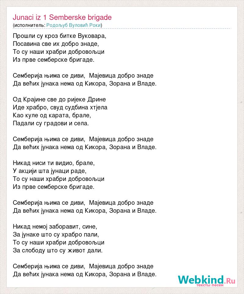 Прошли су кроз битке Вуковара, Посавина све их добро знаде, То су наши храбри добровољци Из прве семберске бригаде. Семберија њима се диви, Мајевица добро знаде Да већих јунака нема од Кикора, Зорана и Владе. Од Крајине све до ријеке Дрине Иде храбро, свуд судбина хтјела Као куле од карата, брале, Падали су градови и села. Семберија њима се диви, Мајевица добро знаде Да већих јунака нема од Кикора, Зорана и Владе. Никад ниси ти видио, брале, У акцији шта јунаци раде, То су наши храбри добровољци Из прве семберске бригаде. Семберија њима се диви, Мајевица добро знаде Да већих јунака нема од Кикора, Зорана и Владе. Никад немој заборавит, сине, За јунаке што су храбро пали, То су наши храбри добровољци За слободу што су живот дали. Семберија њима се диви, Мајевица добро знаде Да већих јунака нема од Кикора, Зорана и Владе.