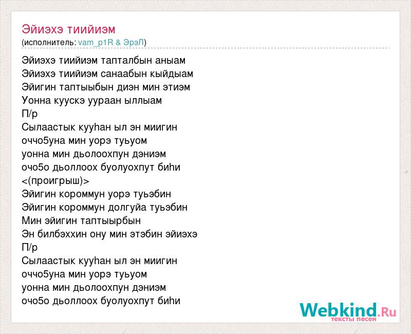 Эйиэхэ тиийиэм тапталбын аныам Эйиэхэ тиийиэм санаабын кыйдыам Эйигин таптыыбын диэн мин этиэм Уонна куускэ уураан ыллыам П/р Сылаастык кууhан ыл эн миигин оччо5уна мин уорэ туьуом уонна мин дьолоохпун дэниэм очо5о дьоллоох буолуохпут биhи <(проигрыш)> Эйигин короммун уорэ туьэбин Эйигин короммун долгуйа туьэбин Мин эйигин таптыырбын Эн билбэххин ону мин этэбин эйиэхэ П/р Сылаастык кууhан ыл эн миигин оччо5уна мин уорэ туьуом уонна мин дьолоохпун дэниэм очо5о дьоллоох буолуохпут биhи