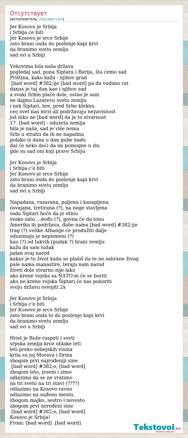 Jer Kosovo je Srbija i Srbija će biti Jer Kosovo je srce Srbije zato brani onda do poslenje kapi krvi da branimo svetu zemlju sad svi u Srbiji Vekovima bila naša država pogledaj sad, puna Šiptara i Barija, šta ćemo sad Priština, kako kažu - njihov grad oružije u ruke pa da vodimo rat danas je taj dan kao i njihov sad a svaki Srbin plače dole, ostao je sam ne dajmo Lazarevu svetu zemlju i nek Šiptari, bre, pred Srbe kleknu ceo svet nas mrzi ali podržavaju nezavisnost još niko ne veruje da je to stvarnost 17. februar - oduzeta zemlja bila je naša, sad je više nema Srbi u strahu da ih ne napadnu polako iz dana u dan gube nadu dal će neko doći da im pomogne u zlu gde su sad oni koji prave Srbiju Jer Kosovo je Srbija i Srbija c'e biti Jer Kosovo je srce Srbije zato brani onda do poslenje kapi krvi da branimo svetu zemlju sad svi u Srbiji Napadana, razarana, paljena i kasapljena osvajana, tretirana (?), na noge stavljena sada Šiptari hoće da je otmu svako zato....dođu (?), govna će da tonu Amerika ih podržava, đabe nama oružije trag (?) velike Albanije će produžiti dalje oduzimaju je nepismeni (?) kao (?) od takvih (pudak ?) brani zemlju kažu da sam ludak jadan ovaj narod kakav je to život kada se plašiš da te ne sahrane živog pale nama manastire, teraju nam narod živeti dole stvarno nije lako ako krene vojska sa NATO-m će se boriti ako ne krene vojska Šiptari će nas pokoriti svoju državu osvojiti 2x Jer Kosovo je Srbija i Srbija c'e biti Jer Kosovo je srce Srbije zato brani onda to do poslenje kapi krvi da branimo svetu zemlju sad svi u Srbiji Hrist je Bože raspeti i sveti srpska zemlja kroz oblake leti leti preko nebejskih visina krila su joj Morava i Drina zbogom prvi najrođeniji sine zbogom ružo, zbogom ruzmarine zbogom leto, jeseni i zimo odlazimo da se ne vratimo na tri sveto na tri stavi (????) odlazimo na Kosovo ravno odlazimo na suđeno mesto, zbogom majko, sestro i nevesto zbogom prvi nerođeni sine zbogom ružo, zbogom ruzmarine Kosovo je Srbija! From: [bad word] [bad word]