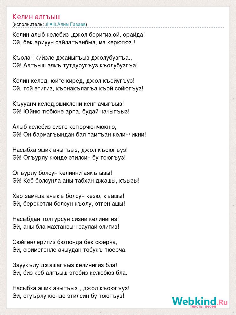 Келин алыб келебиз ,джол беригиз,ой, орайда! Эй, бек ариуун сайлагъанбыз, ма керюгюз.! Къолан кийзле джайыгъыз джолубузгъа., Эй! Алгъыш аякъ тутдуругъуз къолубузгъа! Келин келед, юйге киред, джол къойугъуз! Эй, той этигиз, къонакълагъа къой сойюгъуз! Къууанч келед,эшиклени кенг ачыгъыз! Эй! Юйню тюбюне арпа, будай чачыгъыз! Алыб келебиз сизге кегюрчюнчюкню, Эй! Он бармагъындан бал тамгъан келинчикни! Насыбха эшик ачыгъыз, джол къоюгъуз! Эй! Огъурлу кюнде этилсин бу тоюгъуз! Огъурлу болсун келинни аякъ ызы! Эй! Кеб болсунла аны табхан джашы, къызы! Хар замнда ачыкъ болсун кезю, къашы! Эй, берекетли болсун къолу, этген ашы! Насыбдан толтурсун сизни келинигиз! Эй, аны бла махтансын саулай элигиз! Сюйгенлеригиз бютюнда бек сюерча, Эй, сюймегенле ачыудан тобукъ тюерча. Зауукълу джашагъыз келинигиз бла! Эй, биз кеб алгъыш этебиз келюбюз бла. Насыбха эшик ачыгъыз , джол къоюгъуз! Эй, огуърлу кюнде этилсин бу тоюгъуз!