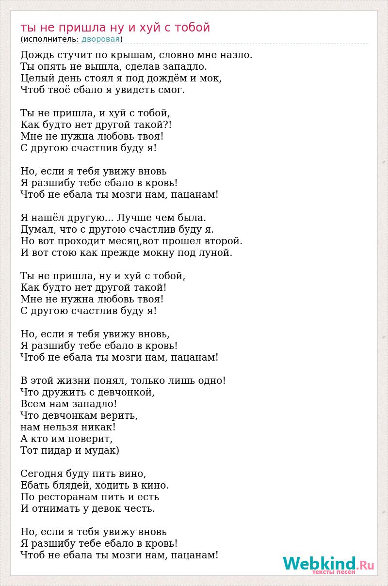 Дождь стучит по крышам, словно мне назло. Ты опять не вышла, сделав западло. Целый день стоял я под дождём и мок, Чтоб твоё ебало я увидеть смог. Ты не пришла, и хуй с тобой, Как будто нет другой такой?! Мне не нужна любовь твоя! С другою счастлив буду я! Но, если я тебя увижу вновь Я разшибу тебе ебало в кровь! Чтоб не ебала ты мозги нам, пацанам! Я нашёл другую... Лучше чем была. Думал, что с другою счастлив буду я. Но вот проходит месяц,вот прошел второй. И вот стою как прежде мокну под луной. Ты не пришла, ну и хуй с тобой, Как будто нет другой такой! Мне не нужна любовь твоя! С другою счастлив буду я! Но, если я тебя увижу вновь, Я разшибу тебе ебало в кровь! Чтоб не ебала ты мозги нам, пацанам! В этой жизни понял, только лишь одно! Что дружить с девчонкой, Всем нам западло! Что девчонкам верить, нам нельзя никак! А кто им поверит, Тот пидар и мудак) Сегодня буду пить вино, Ебать блядей, ходить в кино. По ресторанам пить и есть И отнимать у девок честь. Но, если я тебя увижу вновь Я разшибу тебе ебало в кровь! Чтоб не ебала ты мозги нам, пацанам!