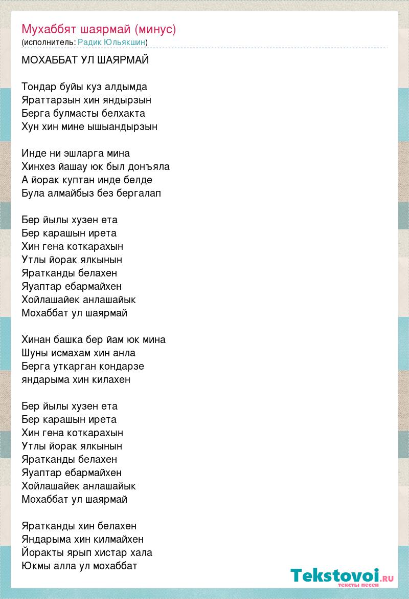 МОХАББАТ УЛ ШАЯРМАЙ Тондар буйы куз алдымда Яраттарзын хин яндырзын Берга булмасты белхакта Хун хин мине ышыандырзын Инде ни эшларга мина Хинхез йашау юк был донъяла А йорак куптан инде белде Була алмайбыз без бергалап Бер йылы хузен ета Бер карашын ирета Хин гена коткарахын Утлы йорак ялкынын Яратканды белахен Яуаптар ебармайхен Хойлашайек анлашайык Мохаббат ул шаярмай Хинан башка бер йам юк мина Шуны исмахам хин анла Берга уткарган кондарзе яндарыма хин килахен Бер йылы хузен ета Бер карашын ирета Хин гена коткарахын Утлы йорак ялкынын Яратканды белахен Яуаптар ебармайхен Хойлашайек анлашайык Мохаббат ул шаярмай Яратканды хин белахен Яндарыма хин килмайхен Йоракты ярып хистар хала Юкмы алла ул мохаббат
