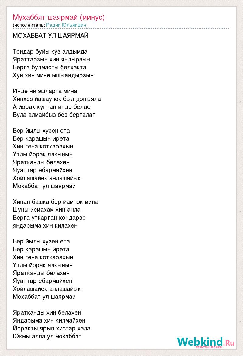 МОХАББАТ УЛ ШАЯРМАЙ Тондар буйы куз алдымда Яраттарзын хин яндырзын Берга булмасты белхакта Хун хин мине ышыандырзын Инде ни эшларга мина Хинхез йашау юк был донъяла А йорак куптан инде белде Була алмайбыз без бергалап Бер йылы хузен ета Бер карашын ирета Хин гена коткарахын Утлы йорак ялкынын Яратканды белахен Яуаптар ебармайхен Хойлашайек анлашайык Мохаббат ул шаярмай Хинан башка бер йам юк мина Шуны исмахам хин анла Берга уткарган кондарзе яндарыма хин килахен Бер йылы хузен ета Бер карашын ирета Хин гена коткарахын Утлы йорак ялкынын Яратканды белахен Яуаптар ебармайхен Хойлашайек анлашайык Мохаббат ул шаярмай Яратканды хин белахен Яндарыма хин килмайхен Йоракты ярып хистар хала Юкмы алла ул мохаббат