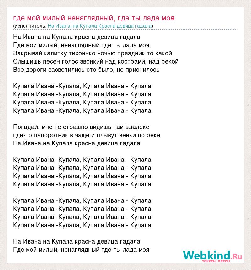 На Ивана на Купала красна девица гадала Где мой милый, ненаглядный где ты лада моя Закрывай калитку тихонько ночью праздник то какой Слышишь песен голос звонкий над кострами, над рекой Все дороги засветились это было, не приснилось Купала Ивана -Купала, Купала Ивана - Купала Купала Ивана -Купала, Купала Ивана - Купала Купала Ивана -Купала, Купала Ивана - Купала Купала Ивана -Купала, Купала Ивана - Купала Погадай, мне не страшно видишь там вдалеке где-то папоротник в чаще и плывут венки по реке На Ивана на Купала красна девица гадала Купала Ивана -Купала, Купала Ивана - Купала Купала Ивана -Купала, Купала Ивана - Купала Купала Ивана -Купала, Купала Ивана - Купала Купала Ивана -Купала, Купала Ивана - Купала Купала Ивана -Купала, Купала Ивана - Купала Купала Ивана -Купала, Купала Ивана - Купала Купала Ивана -Купала, Купала Ивана - Купала Купала Ивана -Купала, Купала Ивана - Купала На Ивана на Купала красна девица гадала Где мой милый, ненаглядный где ты лада моя