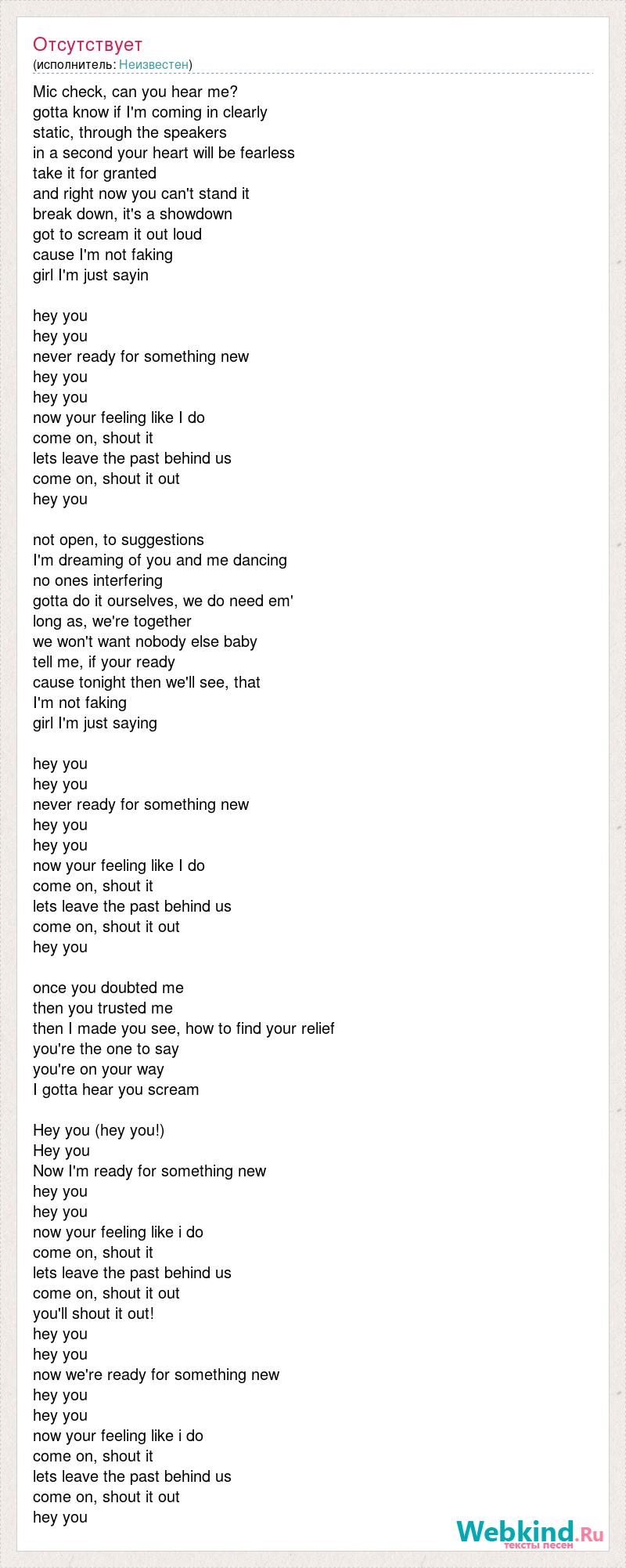 Mic check, can you hear me? gotta know if I'm coming in clearly static, through the speakers in a second your heart will be fearless take it for granted and right now you can't stand it break down, it's a showdown got to scream it out loud cause I'm not faking girl I'm just sayin hey you hey you never ready for something new hey you hey you now your feeling like I do come on, shout it lets leave the past behind us come on, shout it out hey you not open, to suggestions I'm dreaming of you and me dancing no ones interfering gotta do it ourselves, we do need em' long as, we're together we won't want nobody else baby tell me, if your ready cause tonight then we'll see, that I'm not faking girl I'm just saying hey you hey you never ready for something new hey you hey you now your feeling like I do come on, shout it lets leave the past behind us come on, shout it out hey you once you doubted me then you trusted me then I made you see, how to find your relief you're the one to say you're on your way I gotta hear you scream Hey you (hey you!) Hey you Now I'm ready for something new hey you hey you now your feeling like i do come on, shout it lets leave the past behind us come on, shout it out you'll shout it out! hey you hey you now we're ready for something new hey you hey you now your feeling like i do come on, shout it lets leave the past behind us come on, shout it out hey you