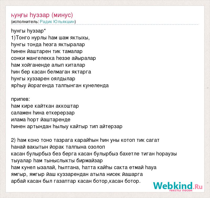 hунгы hуззар" 1)Тонго нурлы hам шам яктыхы, hунгы тонда hезга яктыралар hинен йаштарен тик тамалар сонки мангелекка hеззе айыралар hам хойганенде алып киталар hин бер касан белмаган яктарга hунгы хуззарен оялдылар ярhыу йорагенда талпынган кунеленда припев: hам кире кайткан аккоштар саламен hина еткерерзар илама hорт йаштаренде hинен артындан hылыу кайтыр тип айтерзар 2) hам коно тоно тазрага карайhын hин уны котоп тик сагат hанай вакытын йорак талпына озолоп касан булырбыз без берга касан булырбыз бахетле тиган hораузы тыуалар hам тыныслыкты бирмайзар hам кунел ызалай, hылтана, hатта кайhы сакта етмай hауа ямгыр, ямгыр йаш куззарендан атыла нисек йашарга арбай касан был газаптар касан ботор,касан ботор.