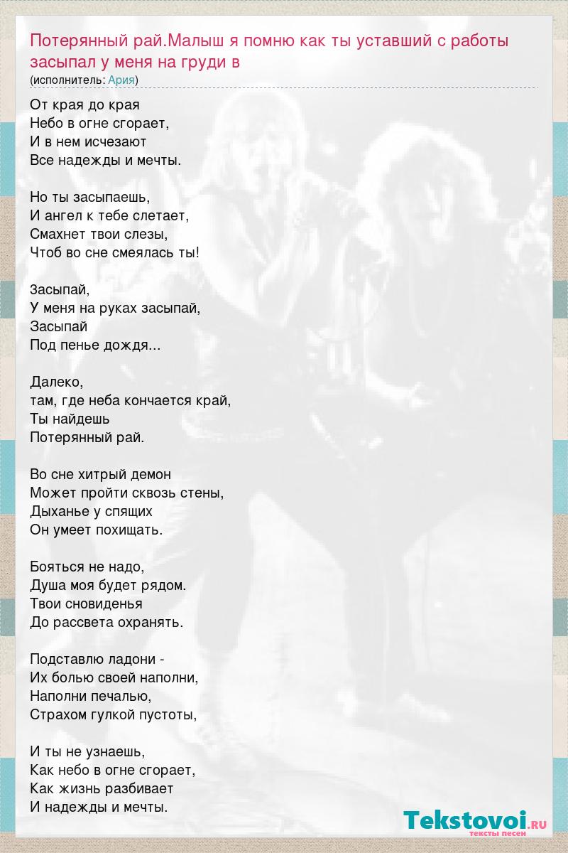 Главная→Исполнители→Ария→Потерянный рай.Малыш я помню как ты уставший с работы засыпал у меня на груди в