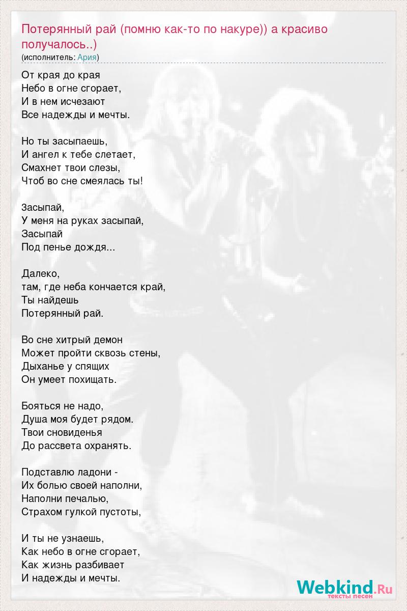 От края до края Небо в огне сгорает, И в нем исчезают Все надежды и мечты. Но ты засыпаешь, И ангел к тебе слетает, Смахнет твои слезы, Чтоб во сне смеялась ты! 3асыпай, У меня на руках засыпай, Засыпай Под пенье дождя... Далеко, там, где неба кончается край, Ты найдешь Потерянный рай. Во сне хитрый демон Может пройти сквозь стены, Дыханье у спящих Он умеет похищать. Бояться не надо, Душа моя будет рядом. Твои сновиденья До рассвета охранять. Подставлю ладони - Их болью своей наполни, Наполни печалью, Страхом гулкой пустоты, И ты не узнаешь, Как небо в огне сгорает, Как жизнь разбивает И надежды и мечты.