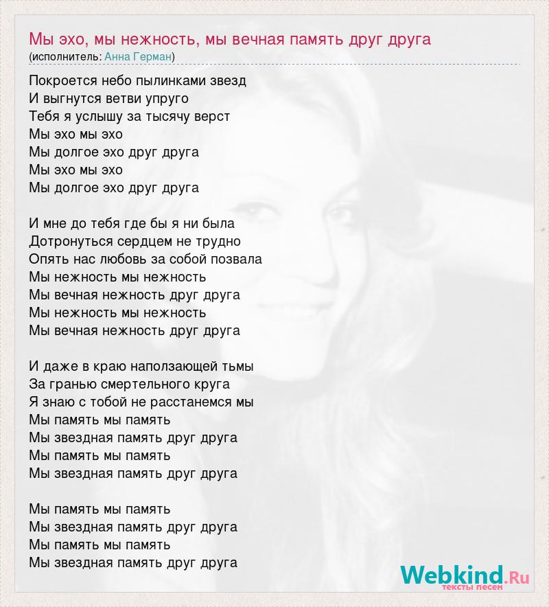 Покроется небо пылинками звезд И выгнутся ветви упруго Тебя я услышу за тысячу верст Мы эхо мы эхо Мы долгое эхо друг друга Мы эхо мы эхо Мы долгое эхо друг друга И мне до тебя где бы я ни была Дотронуться сердцем не трудно Опять нас любовь за собой позвала Мы нежность мы нежность Мы вечная нежность друг друга Мы нежность мы нежность Мы вечная нежность друг друга И даже в краю наползающей тьмы За гранью смертельного круга Я знаю с тобой не расстанемся мы Мы память мы память Мы звездная память друг друга Мы память мы память Мы звездная память друг друга Мы память мы память Мы звездная память друг друга Мы память мы память Мы звездная память друг друга