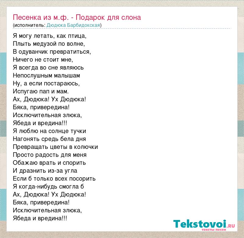 Я могу летать, как птица, Плыть медузой по волне, В одуванчик превратиться, Ничего не стоит мне, Я всегда во сне являюсь Непослушным малышам Ну, а если постараюсь, Испугаю пап и мам. Ах, Дюдюка! Ух Дюдюка! Бяка, привередина! Исключительная злюка, Ябеда и вредина!!! Я люблю на солнце тучки Нагонять средь бела дня Превращать цветы в колючки Просто радость для меня Обажаю врать и спорить И дразнить из-за угла Если б только всех посорить Я когда-нибудь смогла б Ах, Дюдюка! Ух Дюдюка! Бяка, привередина! Исключительная злюка, Ябеда и вредина!!!