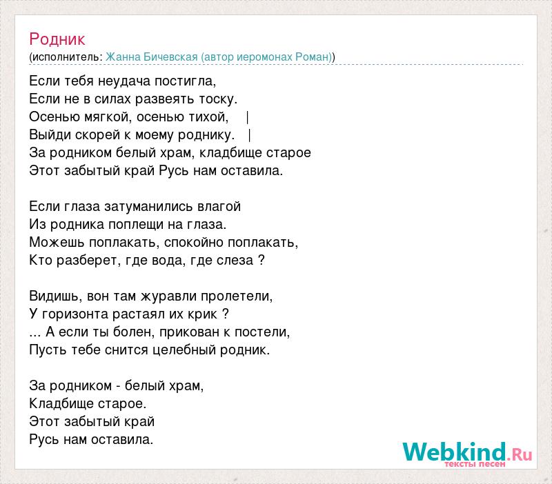 Если тебя неудача постигла, Если не в силах развеять тоску. Осенью мягкой, осенью тихой, | Выйди скорей к моему роднику. | За родником белый храм, кладбище старое Этот забытый край Русь нам оставила. Если глаза затуманились влагой Из родника поплещи на глаза. Можешь поплакать, спокойно поплакать, Кто разберет, где вода, где слеза ? Видишь, вон там журавли пролетели, У горизонта растаял их крик ? ... А если ты болен, прикован к постели, Пусть тебе снится целебный родник. За родником - белый храм, Кладбище старое. Этот забытый край Русь нам оставила.