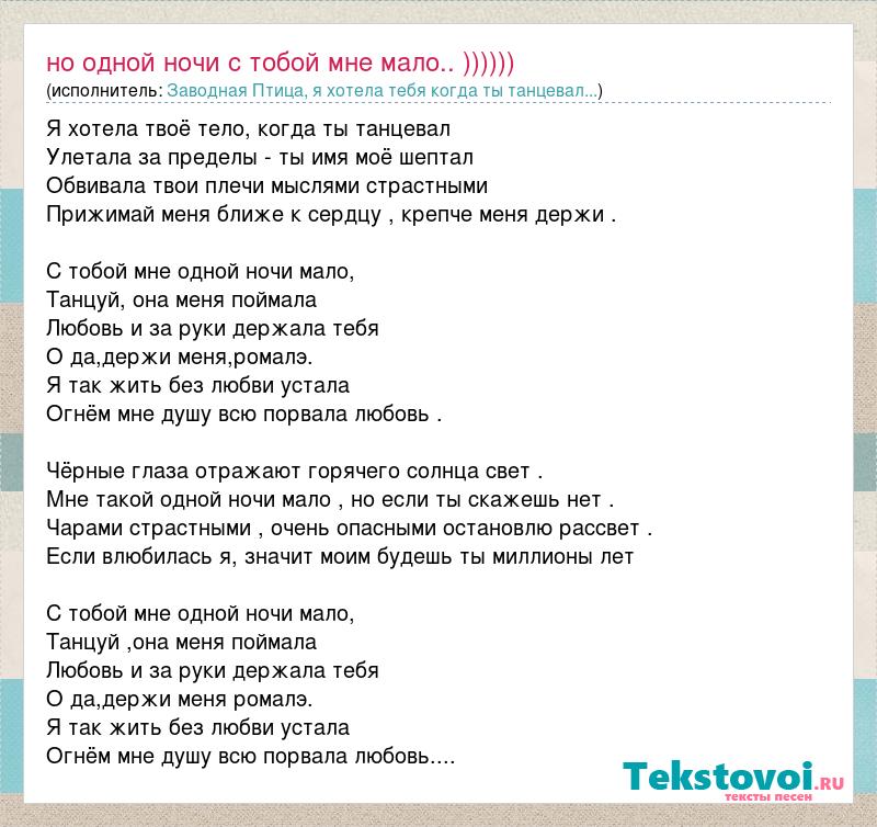 Я хотела твоё тело, когда ты танцевал Улетала за пределы - ты имя моё шептал Обвивала твои плечи мыслями страстными Прижимай меня ближе к сердцу , крепче меня держи . С тобой мне одной ночи мало, Танцуй, она меня поймала Любовь и за руки держала тебя О да,держи меня,ромалэ. Я так жить без любви устала Огнём мне душу всю порвала любовь . Чёрные глаза отражают горячего солнца свет . Мне такой одной ночи мало , но если ты скажешь нет . Чарами страстными , очень опасными остановлю рассвет . Если влюбилась я, значит моим будешь ты миллионы лет С тобой мне одной ночи мало, Танцуй ,она меня поймала Любовь и за руки держала тебя О да,держи меня ромалэ. Я так жить без любви устала Огнём мне душу всю порвала любовь....