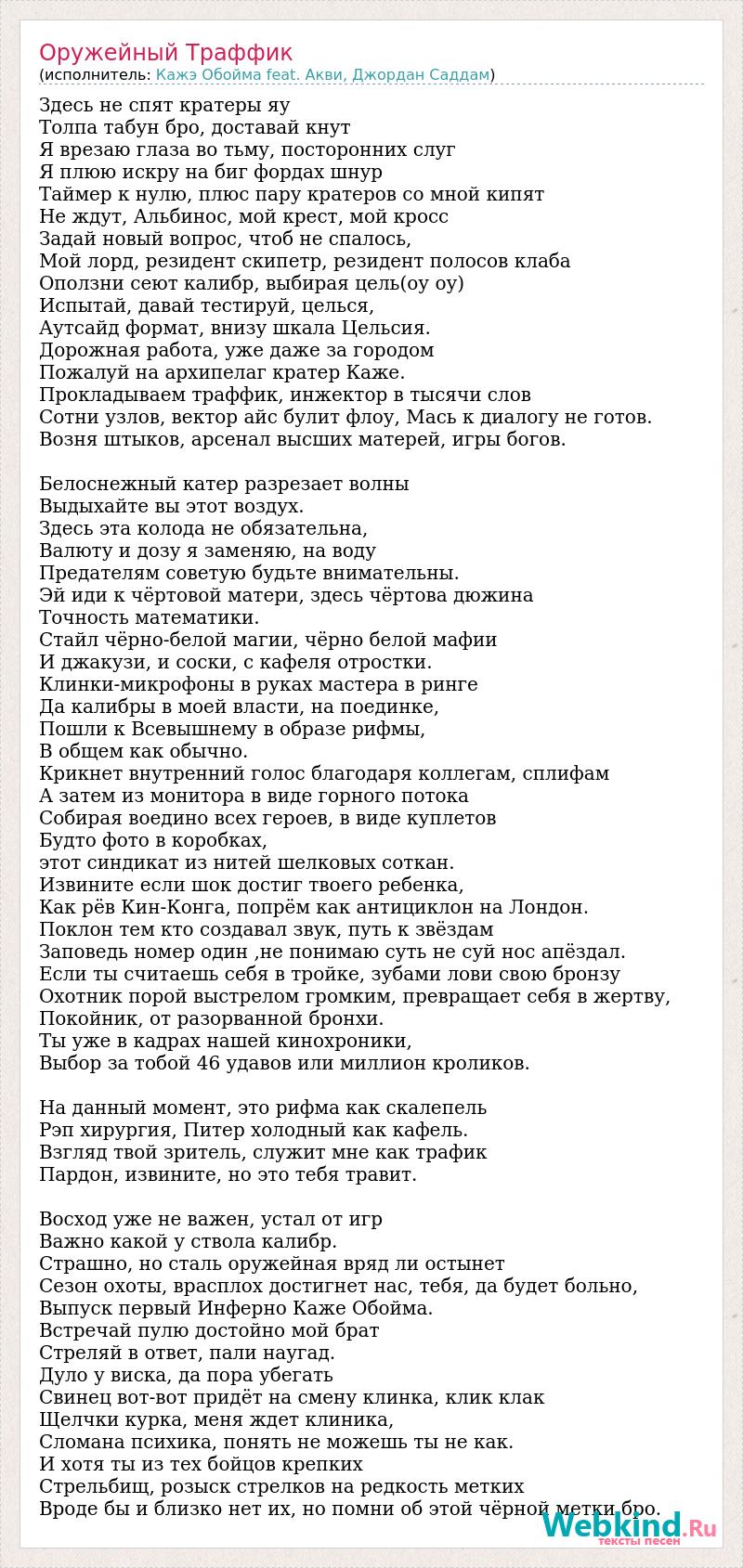 Здесь не спят кратеры яу Толпа табун бро, доставай кнут Я врезаю глаза во тьму, посторонних слуг Я плюю искру на биг фордах шнур Таймер к нулю, плюс пару кратеров со мной кипят Не ждут, Альбинос, мой крест, мой кросс Задай новый вопрос, чтоб не спалось, Мой лорд, резидент скипетр, резидент полосов клаба Оползни сеют калибр, выбирая цель(оу оу) Испытай, давай тестируй, целься, Аутсайд формат, внизу шкала Цельсия. Дорожная работа, уже даже за городом Пожалуй на архипелаг кратер Каже. Прокладываем траффик, инжектор в тысячи слов Сотни узлов, вектор айс булит флоу, Мась к диалогу не готов. Возня штыков, арсенал высших матерей, игры богов. Белоснежный катер разрезает волны Выдыхайте вы этот воздух. Здесь эта колода не обязательна, Валюту и дозу я заменяю, на воду Предателям советую будьте внимательны. Эй иди к чёртовой матери, здесь чёртова дюжина Точность математики. Стайл чёрно-белой магии, чёрно белой мафии И джакузи, и соски, с кафеля отростки. Клинки-микрофоны в руках мастера в ринге Да калибры в моей власти, на поединке, Пошли к Всевышнему в образе рифмы, В общем как обычно. Крикнет внутренний голос благодаря коллегам, сплифам А затем из монитора в виде горного потока Собирая воедино всех героев, в виде куплетов Будто фото в коробках, этот синдикат из нитей шелковых соткан. Извините если шок достиг твоего ребенка, Как рёв Кин-Конга, попрём как антициклон на Лондон. Поклон тем кто создавал звук, путь к звёздам Заповедь номер один ,не понимаю суть не суй нос апёздал. Если ты считаешь себя в тройке, зубами лови свою бронзу Охотник порой выстрелом громким, превращает себя в жертву, Покойник, от разорванной бронхи. Ты уже в кадрах нашей кинохроники, Выбор за тобой 46 удавов или миллион кроликов. На данный момент, это рифма как скалепель Рэп хирургия, Питер холодный как кафель. Взгляд твой зритель, служит мне как трафик Пардон, извините, но это тебя травит. Восход уже не важен, устал от игр Важно какой у ствола калибр. Страшно, но сталь оружейная вряд ли остынет Сезон охоты, врасплох достигнет нас, тебя, да будет больно, Выпуск первый Инферно Каже Обойма. Встречай пулю достойно мой брат Стреляй в ответ, пали наугад. Дуло у виска, да пора убегать Свинец вот-вот придёт на смену клинка, клик клак Щелчки курка, меня ждет клиника, Сломана психика, понять не можешь ты не как. И хотя ты из тех бойцов крепких Стрельбищ, розыск стрелков на редкость метких Вроде бы и близко нет их, но помни об этой чёрной метки бро.