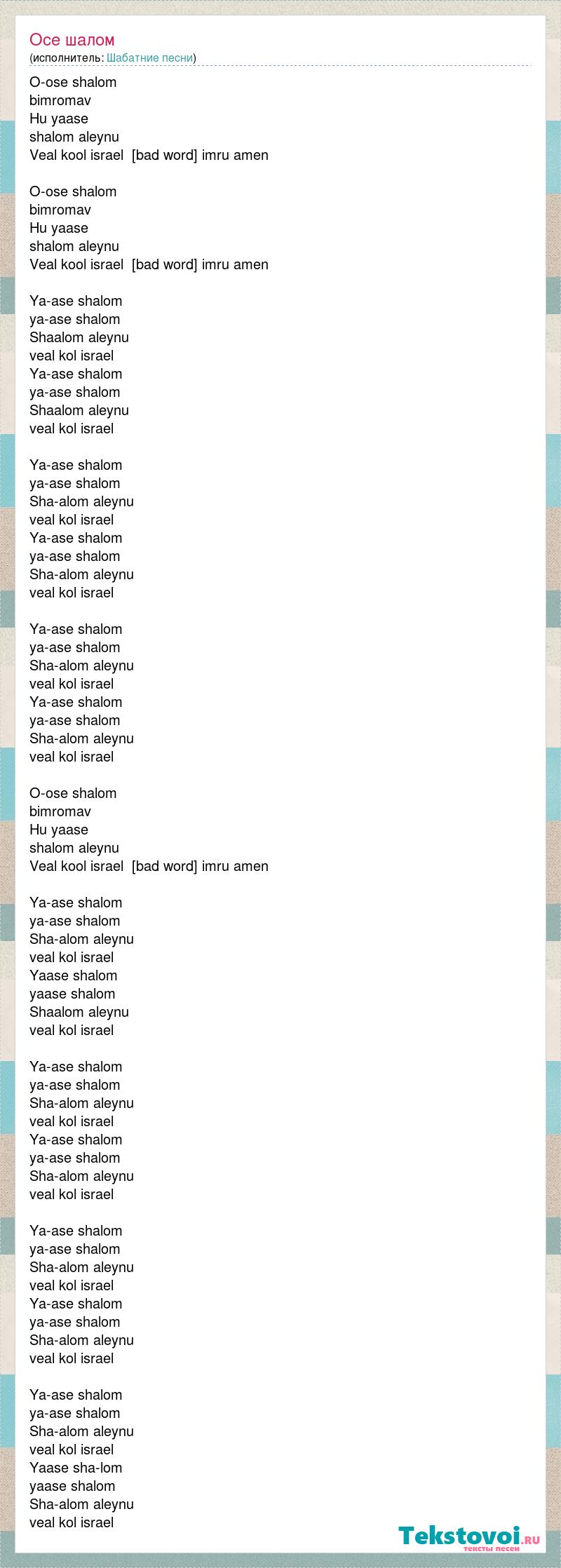 O-ose shalom bimromav Hu yaase shalom aleynu Veal kool israel veimru imru amen O-ose shalom bimromav Hu yaase shalom aleynu Veal kool israel veimru imru amen Ya-ase shalom ya-ase shalom Shaalom aleynu veal kol israel Ya-ase shalom ya-ase shalom Shaalom aleynu veal kol israel Ya-ase shalom ya-ase shalom Sha-alom aleynu veal kol israel Ya-ase shalom ya-ase shalom Sha-alom aleynu veal kol israel Ya-ase shalom ya-ase shalom Sha-alom aleynu veal kol israel Ya-ase shalom ya-ase shalom Sha-alom aleynu veal kol israel O-ose shalom bimromav Hu yaase shalom aleynu Veal kool israel veimru imru amen Ya-ase shalom ya-ase shalom Sha-alom aleynu veal kol israel Yaase shalom yaase shalom Shaalom aleynu veal kol israel Ya-ase shalom ya-ase shalom Sha-alom aleynu veal kol israel Ya-ase shalom ya-ase shalom Sha-alom aleynu veal kol israel Ya-ase shalom ya-ase shalom Sha-alom aleynu veal kol israel Ya-ase shalom ya-ase shalom Sha-alom aleynu veal kol israel Ya-ase shalom ya-ase shalom Sha-alom aleynu veal kol israel Yaase sha-lom yaase shalom Sha-alom aleynu veal kol israel