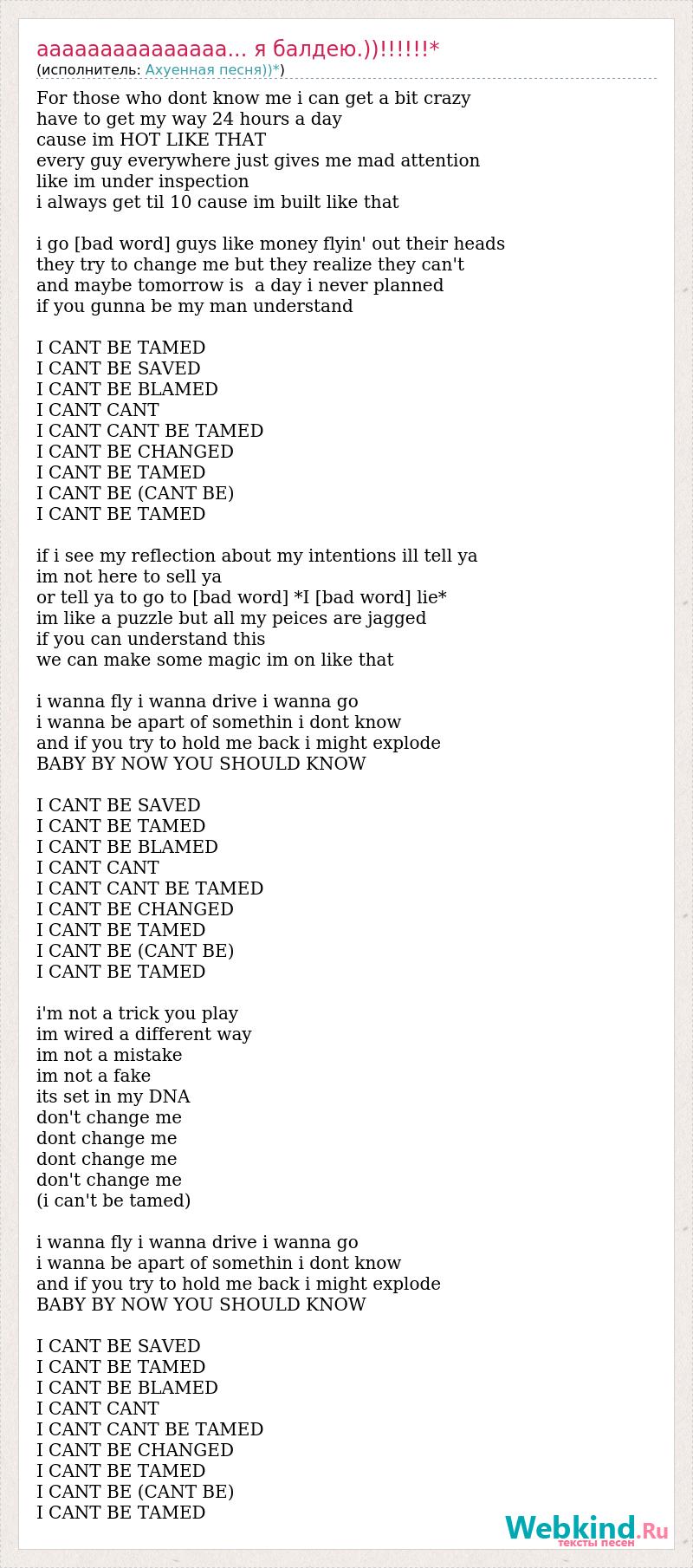 For those who dont know me i can get a bit crazy have to get my way 24 hours a day cause im HOT LIKE THAT every guy everywhere just gives me mad attention like im under inspection i always get til 10 cause im built like that i go [bad word] guys like money flyin' out their heads they try to change me but they realize they can't and maybe tomorrow is a day i never planned if you gunna be my man understand I CANT BE TAMED I CANT BE SAVED I CANT BE BLAMED I CANT CANT I CANT CANT BE TAMED I CANT BE CHANGED I CANT BE TAMED I CANT BE (CANT BE) I CANT BE TAMED if i see my reflection about my intentions ill tell ya im not here to sell ya or tell ya to go to [bad word] *I [bad word] lie* im like a puzzle but all my peices are jagged if you can understand this we can make some magic im on like that i wanna fly i wanna drive i wanna go i wanna be apart of somethin i dont know and if you try to hold me back i might explode BABY BY NOW YOU SHOULD KNOW I CANT BE SAVED I CANT BE TAMED I CANT BE BLAMED I CANT CANT I CANT CANT BE TAMED I CANT BE CHANGED I CANT BE TAMED I CANT BE (CANT BE) I CANT BE TAMED i'm not a trick you play im wired a different way im not a mistake im not a fake its set in my DNA don't change me dont change me dont change me don't change me (i can't be tamed) i wanna fly i wanna drive i wanna go i wanna be apart of somethin i dont know and if you try to hold me back i might explode BABY BY NOW YOU SHOULD KNOW I CANT BE SAVED I CANT BE TAMED I CANT BE BLAMED I CANT CANT I CANT CANT BE TAMED I CANT BE CHANGED I CANT BE TAMED I CANT BE (CANT BE) I CANT BE TAMED