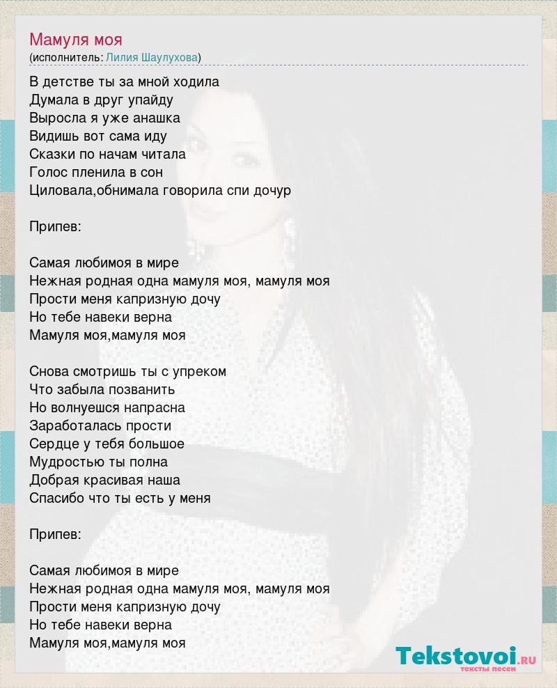 В детстве ты за мной ходила Думала в друг упайду Выросла я уже анашка Видишь вот сама иду Сказки по начам читала Голос пленила в сон Циловала,обнимала говорила спи дочур Припев: Самая любимоя в мире Нежная родная одна мамуля моя, мамуля моя Прости меня капризную дочу Но тебе навеки верна Мамуля моя,мамуля моя Снова смотришь ты с упреком Что забыла позванить Но волнуешся напрасна Заработалась прости Сердце у тебя большое Мудростью ты полна Добрая красивая наша Спасибо что ты есть у меня Припев: Самая любимоя в мире Нежная родная одна мамуля моя, мамуля моя Прости меня капризную дочу Но тебе навеки верна Мамуля моя,мамуля моя