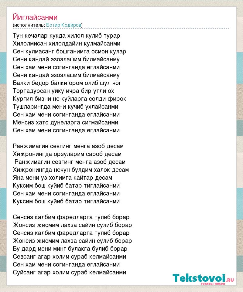 Тун кечалар кукда хилол кулиб турар Хилолмисан хилолдайин кулмайсанми Сен кулмасанг бошганимга осмон кулар Сени кандай эзозлашим билмайсанму Сен хам мени согинганда еглайсанми Сени кандай эзозлашим билмайсанму Балки бедор балки ором олиб шул чог Тортадурсан уйку ичра бир утли ох Кургил бизни не куйларга солди фирок Тушларингда мени кучиб ухлайсанми Сен хам мени согинганда еглайсанми Менсиз хато дунеларга сигмайсанми Сен хам мени согинганда еглайсанми Ранжимагин севгинг менга азоб десам Хижронингда орзуларим сароб десам Ранжимагин севгинг менга азоб десам Хижронингда нечун булдим халок десам Яна мени уз холимга кайтар десам Куксим бош куйиб батар тиглайсанми Сен хам мени согинганда еглайсанми Куксим бош куйиб батар тиглайсанми Сенсиз калбим фаредларга тулиб борар Жонсиз жисмим лахза сайин сулиб борар Сенсиз калбим фаредларга тулиб борар Жонсиз жисмим лахза сайин сулиб борар Бу дард мени минг булакга булиб борар Севсанг агар холим сураб келмайсанми Сен хам мени согинганда еглайсанми Суйсанг агар холим сураб келмайсанми