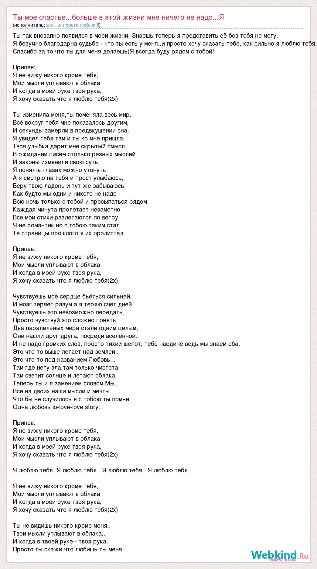 Ты так внезапно появился в моей жизни, Знаешь теперь я представить её без тебя не могу. Я безумно благодарна судьбе - что ты есть у меня..и просто хочу сказать тебе, как сильно я люблю тебя, Спасибо за то что ты для меня делаешь)Я всегда буду рядом с тобой! Припев: Я не вижу никого кроме тебя, Мои мысли уплывают в облака И когда в моей руке твоя рука, Я хочу сказать что я люблю тебя(2х) Ты изменила меня,ты поменяла весь мир. Всё вокруг тебя мне показалось другим, И секунды замерли в предвкушении сна, Я увидел тебя там и ты ко мне пришла. Твоя улыбка дарит мне скрытый смысл. В ожидании писем столько разных мыслей И законы изменили свою суть Я понял-в глазах можно утонуть А я смотрю на тебя и прост улыбаюсь, Беру твою ладонь и тут же забываюсь Как будто мы одни и никого не надо Всю ночь только с тобой и просыпаться рядом Каждая минута пролетает незаметно Все мои стихи разлетаются по ветру Я не романтик но с тобою таким стал Те страницы прошлого я их пролистал. Припев: Я не вижу никого кроме тебя, Мои мысли уплывают в облака И когда в моей руке твоя рука, Я хочу сказать что я люблю тебя(2х) Чувствуешь моё сердце бьёться сильней, И мозг теряет разум,а я теряю счёт дней. Чувствуешь это невозможно передать, Просто чувствуй,это сложно понять. Два паралельных мира стали одним целым, Они нашли друг друга, посреди вселенной. И не надо громких слов, просто тихий шепот, тебе наедине ведь мы знаем оба. Это что-то выше летает над землей.. Это что-то под названием Любовь... Там где нету зла,там только чистота. Там светит солнце и летают облака. Теперь ты и я замением словом Мы.. Всё на двоих наши мысли и мечты. Что бы не случилось я с тобою ты помни. Одна любовь lo-love-love story... Припев: Я не вижу никого кроме тебя, Мои мысли уплывают в облака И когда в моей руке твоя рука, Я хочу сказать что я люблю тебя(2х) Я люблю тебя..Я люблю тебя ..Я люблю тебя ..Я люблю тебя.. Я не вижу никого кроме тебя, Мои мысли уплывают в облака И когда в моей руке твоя рука, Я хочу сказать что я люблю тебя(2х) Ты не видишь никого кроме меня.. Твои мысли уплывают в облака.. И когда в твоей руке - твоя рука.. Просто ты скажи что любишь ты меня..