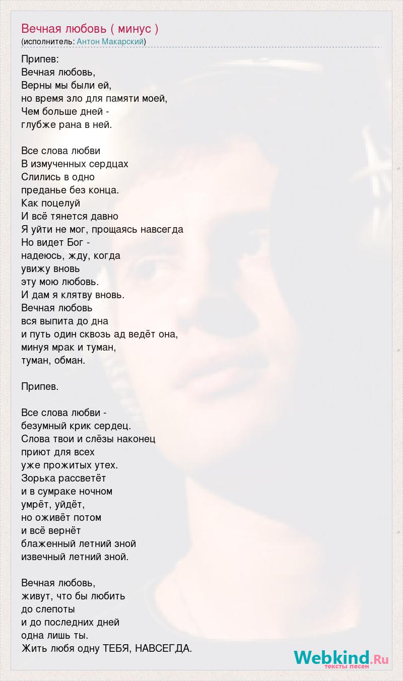 Припев: Вечная любовь, Верны мы были ей, но время зло для памяти моей, Чем больше дней - глубже рана в ней. Все слова любви В измученных сердцах Слились в одно преданье без конца. Как поцелуй И всё тянется давно Я уйти не мог, прощаясь навсегда Но видет Бог - надеюсь, жду, когда увижу вновь эту мою любовь. И дам я клятву вновь. Вечная любовь вся выпита до дна и путь один сквозь ад ведёт она, минуя мрак и туман, туман, обман. Припев. Все слова любви - безумный крик сердец. Слова твои и слёзы наконец приют для всех уже прожитых утех. Зорька рассветёт и в сумраке ночном умрёт, уйдёт, но оживёт потом и всё вернёт блаженный летний зной извечный летний зной. Вечная любовь, живут, что бы любить до слепоты и до последних дней одна лишь ты. Жить любя одну ТЕБЯ, НАВСЕГДА.