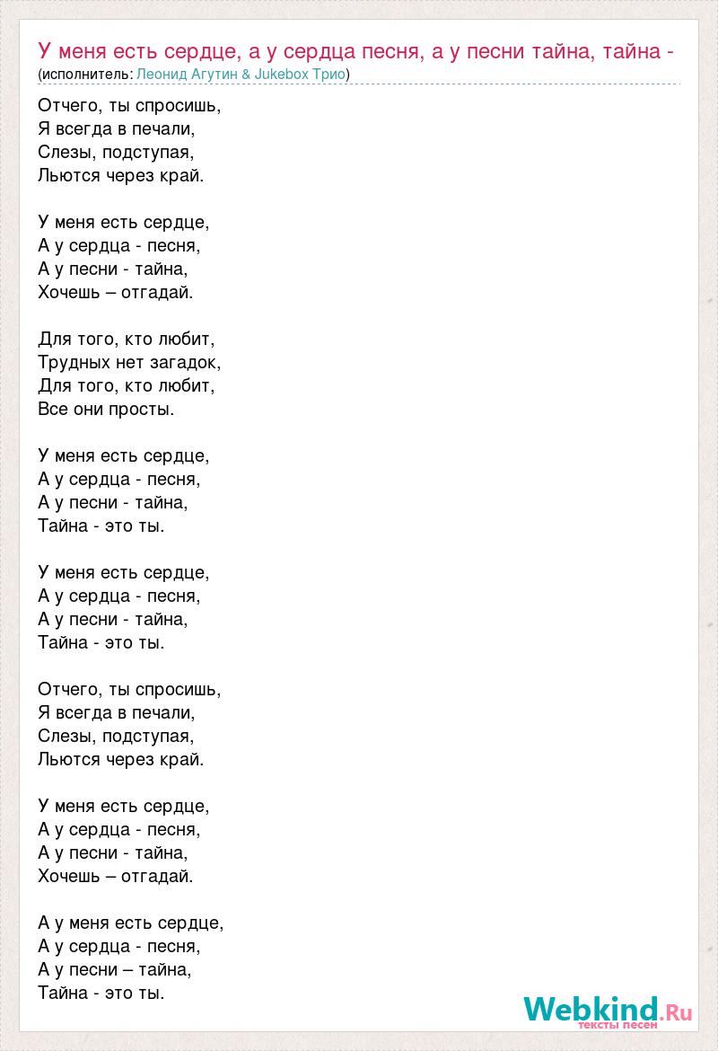 Отчего, ты спросишь, Я всегда в печали, Слезы, подступая, Льются через край. У меня есть сердце, А у сердца - песня, А у песни - тайна, Хочешь – отгадай. Для того, кто любит, Трудных нет загадок, Для того, кто любит, Все они просты. У меня есть сердце, А у сердца - песня, А у песни - тайна, Тайна - это ты. У меня есть сердце, А у сердца - песня, А у песни - тайна, Тайна - это ты. Отчего, ты спросишь, Я всегда в печали, Слезы, подступая, Льются через край. У меня есть сердце, А у сердца - песня, А у песни - тайна, Хочешь – отгадай. А у меня есть сердце, А у сердца - песня, А у песни – тайна, Тайна - это ты.