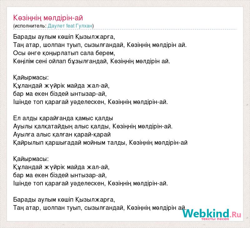 Барады аулым көшіп Қызылжарға, Таң атар, шолпан туып, сызылғандай, Көзіңнің мөлдірін ай. Осы әнге қоңырлатып сала берем, Көңілім сені ойлап бұзылғандай, Көзіңнің мөлдірін ай. Қайырмасы: Құландай жүйрік майда жал-ай, бар ма екен біздей ынтызар-ай, Ішінде топ қарағай уәделескен, Көзіңнің мөлдірін-ай. Ел алды қарайғанда қамыс қалды Ауылы қалқатайдың алыс қалды, Көзіңнің мөлдірін-ай. Ауылға алыс қалған қарай-қарай Қайрылып қаршығадай мойным талды, Көзіңнің мөлдірін-ай Қайырмасы: Құландай жүйрік майда жал-ай, бар ма екен біздей ынтызар-ай, Ішінде топ қарағай уәделескен, Көзіңнің мөлдірін-ай. Барады аулым көшіп Қызылжарға, Таң атар, шолпан туып, сызылғандай, Көзіңнің мөлдірін ай.