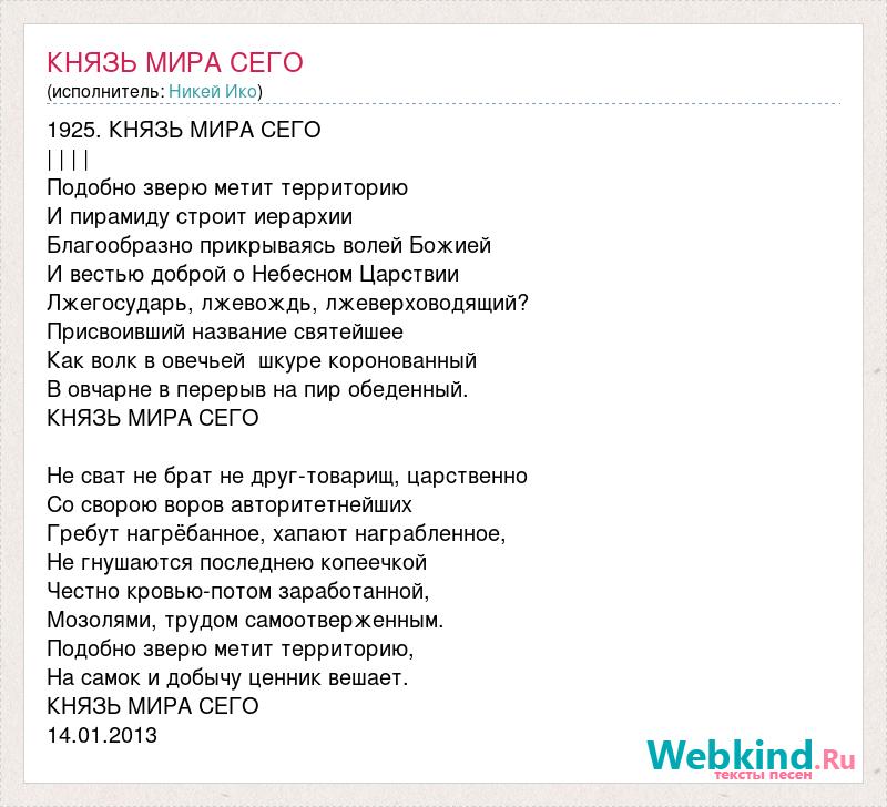 А как ты думаешь, о чем песня "КНЯЗЬ МИРА СЕГО" ?