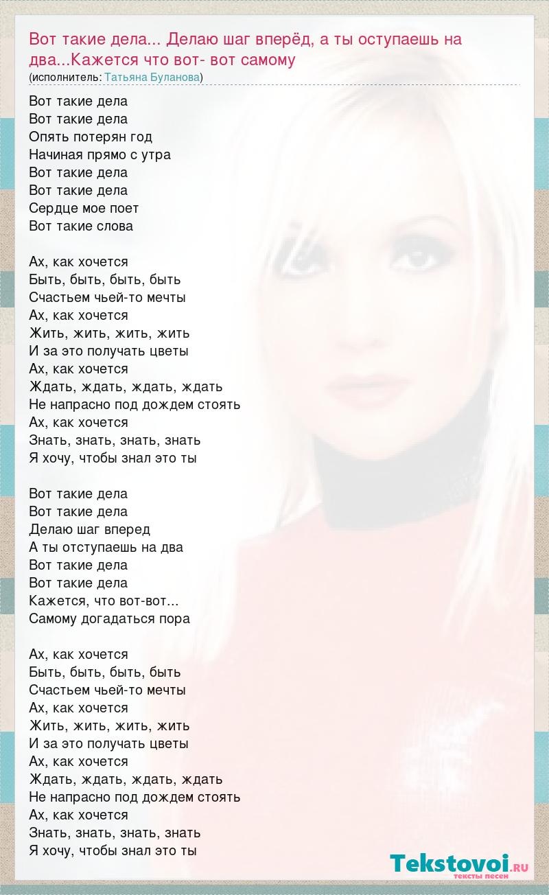 Главная→Исполнители→Татьяна Буланова→Вот такие дела... Делаю шаг вперёд, а ты оступаешь на два...Кажется что вот- вот